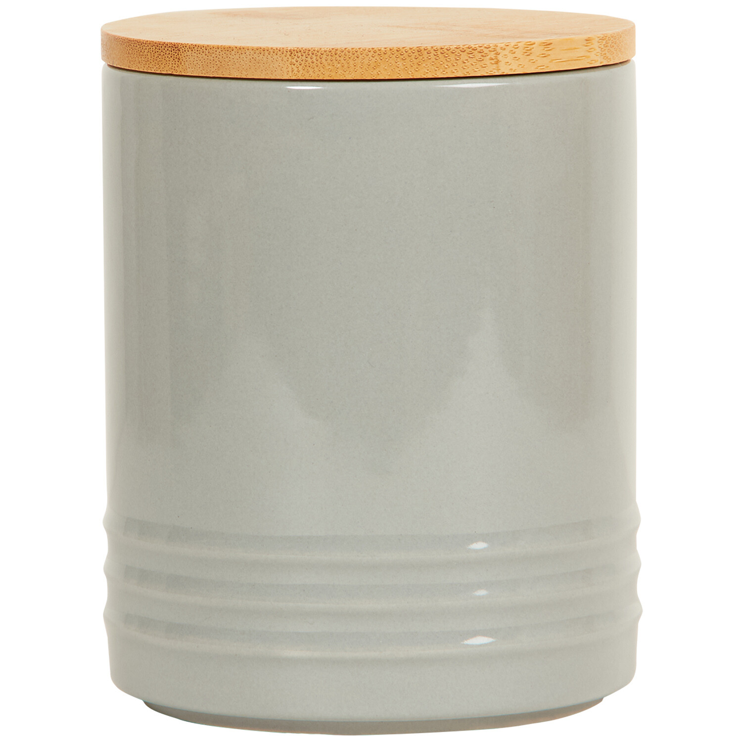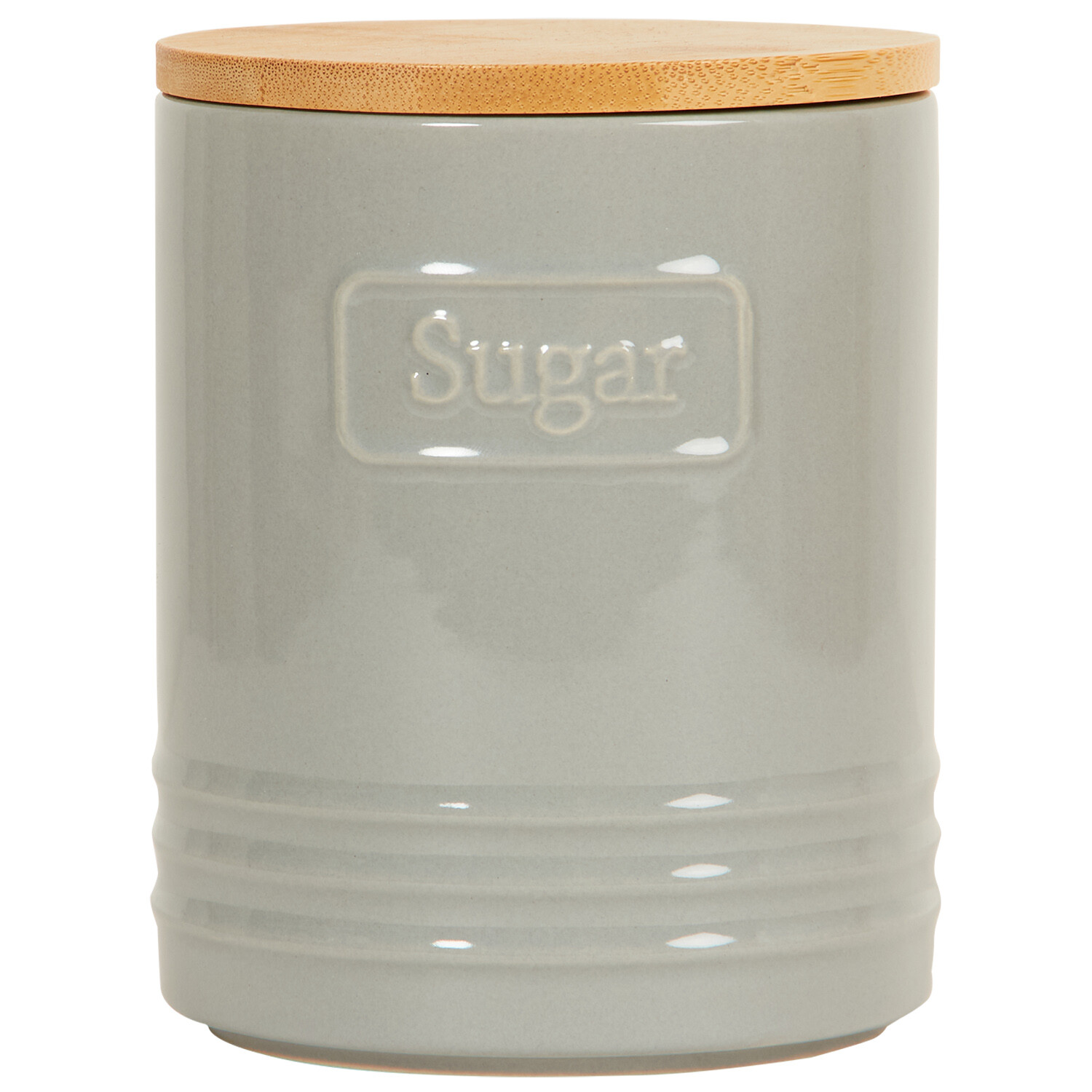 Store sugar in classic style with this Canister with Bamboo Lid. It features a glossy finish in grey with embossed lettering and horizontal ribs at the round base for a neutral design to coordinate with almost any kitchen decor theme. Complete with a bamboo lid with a silicone seal, it'll make a practical addition to your kitchen.