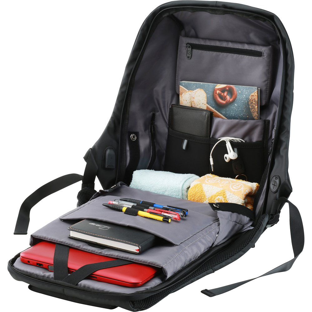 Transform the way you travel with the Canyon 15.6 inch Black Anti Theft Laptop Backpack. It is perfect for every journey, whether you are on public transport, at school or enjoying a vacation. It is designed for safety, keeping your belongings safe. This backpack features a smart system of hidden pockets, allowing you to neatly store all your gadgets. Made from waterproof material, it protects your items from rain and spills. The durable fabric and internal zippers ensure that no one can open your backpack without you noticing. With a capacity of 20 litres, it has plenty of space and includes 11 pockets to help you stay organised. The anti-theft hidden zipper adds an extra layer of security. You can also charge your devices easily with the external USB 2.0 connector. The backpack opens to 180 degrees for easy access and is protected from cuts. It maintains its shape and has a belt to attach it to a suitcase handle for convenience.
