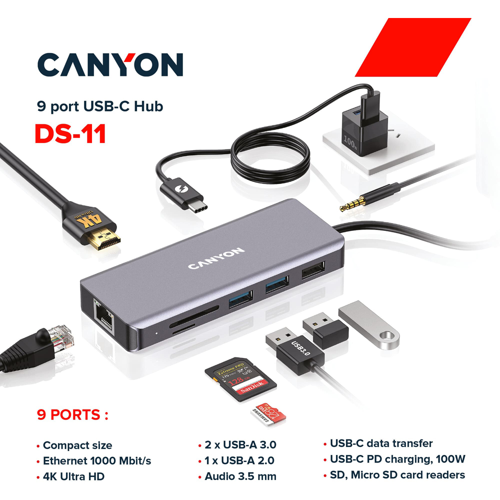 Canyon DS-11 9 in 1 USB C Space Grey Docking Station