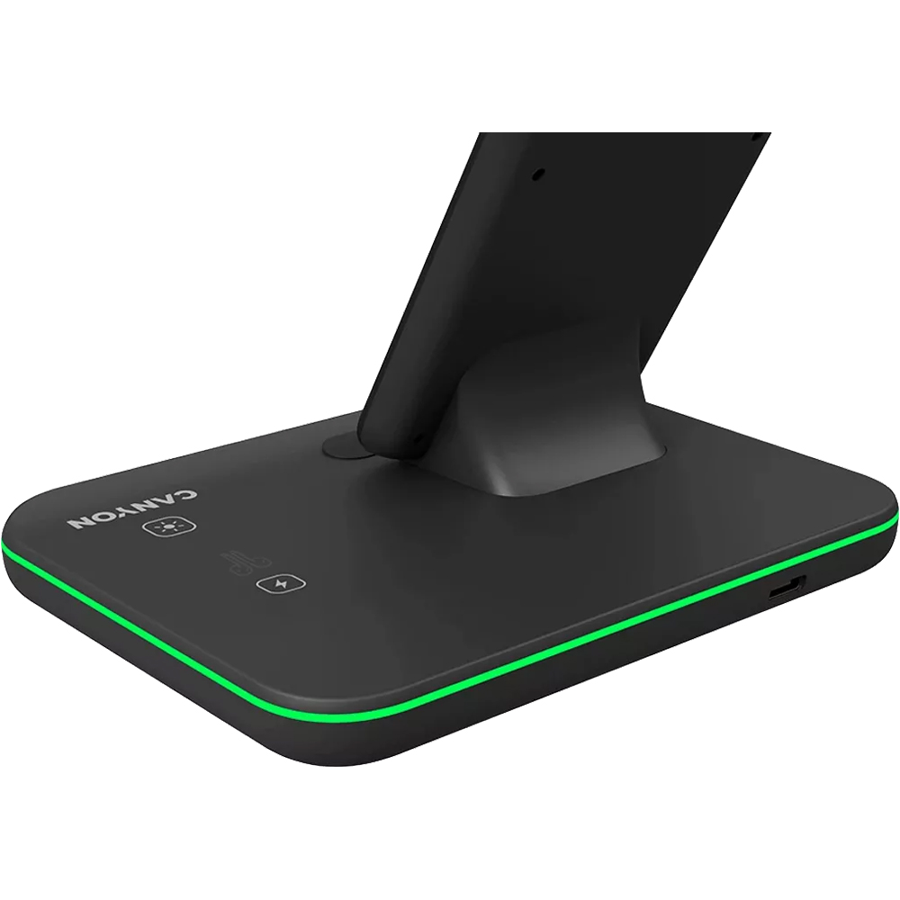 Let go of tangled cords and discover the future of charging with the Canyon WS-303 3 in 1 Black Wireless Charger 15W. This reliable wireless charger is designed for those who love the latest gadgets as well as seek convenience and functionality. This charging station delivers rapid charging for any QI-integrated device. Whether you have an iOS device or another modern gadget, the built-in Nuvoton chipset ensures quick and safe charging. Its smart design lets you charge your Apple Watch, iPhone, and Air pods at the same time, each in their designated zones. With a generous charging distance of up to seven millimetres, you can power your phone without needing to take off the case. The sleek dark black finish makes it a stylish addition to any interior. This charger is a great solution for keeping your gadgets organised, saving space, and cutting down on messy wires. It is compatible with the iWatch 3 to 8 series and can charge three devices simultaneously. Plus, the anti-slip rubber-coated base keeps everything securely in place. You can enjoy easy access with the touch button that controls the backlight.