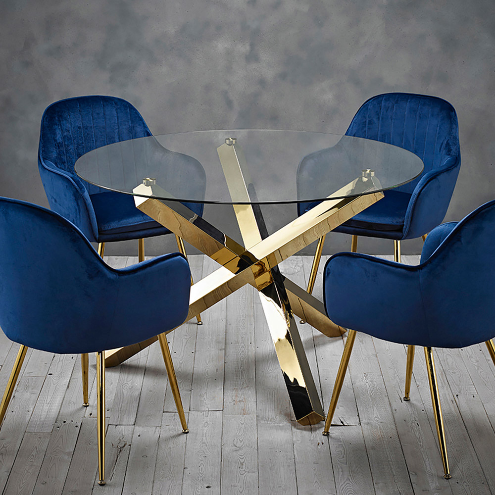 Infuse an air of sophistication into your dining area with the stunning Capri 4 Seater Glass Dining Table Gold. This elegant piece features striking gold-finished legs and a sleek clear glass top, exuding timeless allure. Pair it with the stylish chairs, boasting matching gold legs, to create a cohesive and luxurious dining ensemble that is sure to impress. The contemporary design and clear glass top of this range will undoubtedly set your dining area apart. Please note that the chairs are not included with this product, and self-assembly is required as the product comes flat-packed.