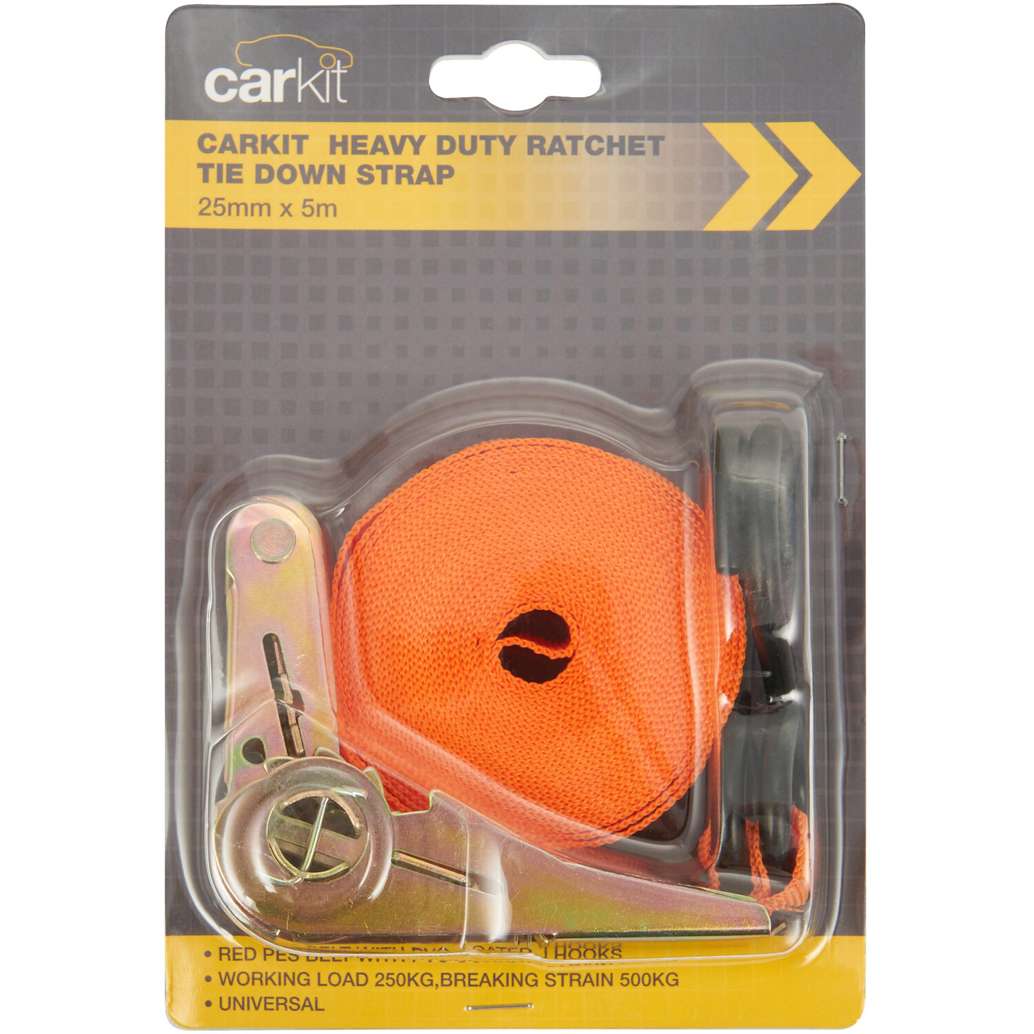Secure your load with this Carkit Heavy Duty Ratchet Tie Down Strap. Offering five metres in length and PVC-coated J hooks, this tie-down strap is great for ensuring your cargo stays put during transport. Ideal for roof racks, truck beds and more, it's an essential that's sure to come in handy.