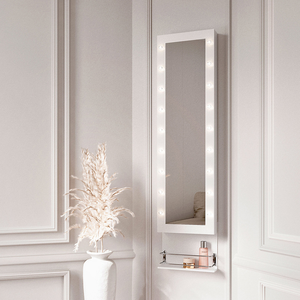 Door-mounted Length Mirror Jewellery Cabinet with LED Light, Hair Dryer Holder, Battery operated. Full-length mirror illuminated with LED lights. The black velvet interior lining protects the jewellery from any scratches or damage. Earring bar, necklace/bracelet hooks and shelves. The extra compartment is the perfect size for a hairdryer. This piece can either be wall-mounted or door-hung. Dimensions: L30 x D13 x H130.5 cm / Weight: 9.6 kgs.