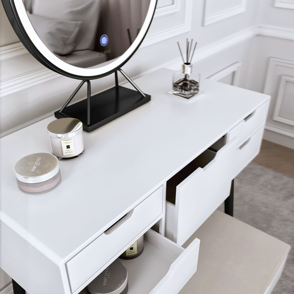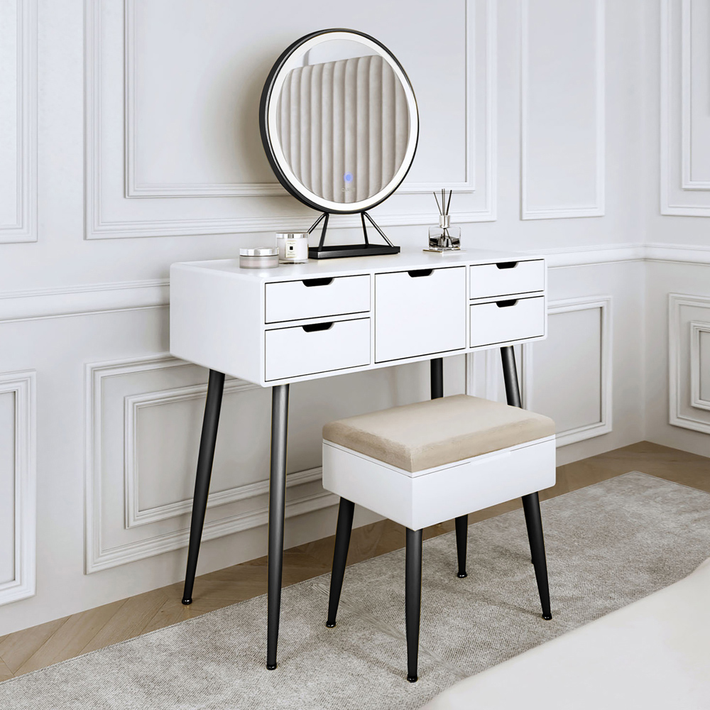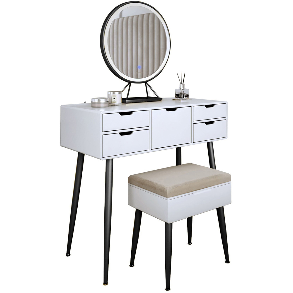 The White and Black Double Deck Vanity Dressing Table features five storage drawers and black finish legs, complemented by a matching flip-top cushion stool with storage. The set includes a touch LED desktop mirror with a medium circular design, featuring a touch sensor dimmer to adjust brightness and three different colour settings: cool, warm, and day. The luxury padded stool has a lift-up lid for additional storage. The overall dimensions are W80 x D40 x H133.5 cm.