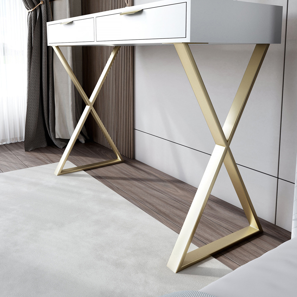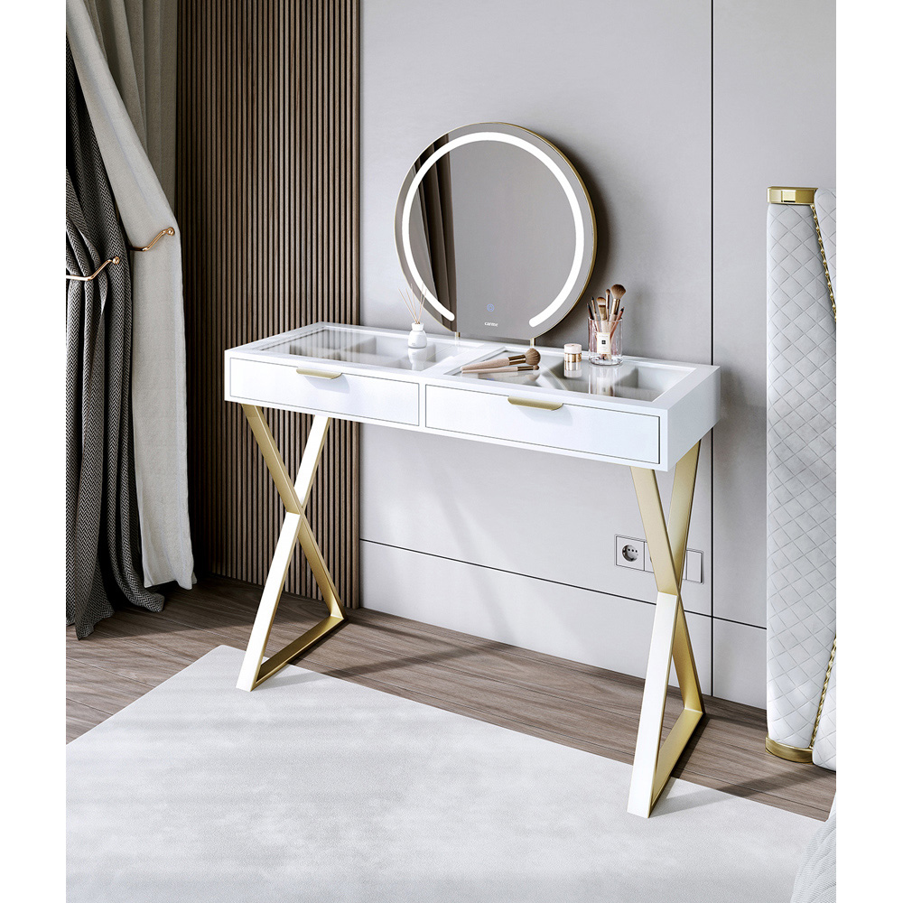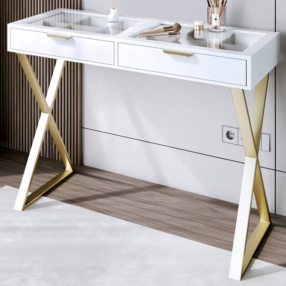 White Glass top Dressing Table with 2 Drawers & X-shaped Gold Leg; Two drawers with grey-lined compartments for organized storage. This dressing table features a sleek and modern design with X-shaped gold metal legs. Two drawers with grey-lined compartments for organized storage. Glass tabletop for a clear view of the drawer contents. Gold metal handles. Easily assembled. Overall Dimensions – W110 x D40 x H79cm.