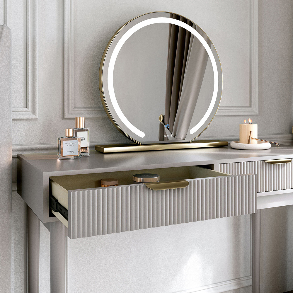 Large Mocha Wood Dressing Table - 2 Drawers with ribbed front finished and Gold handles. Dressing table with two storage drawers. Drawers with ribbed front finished. Gold-toned handles. Easily assembled. Overall Dimensions – W115.5 x D40 x H79cm.