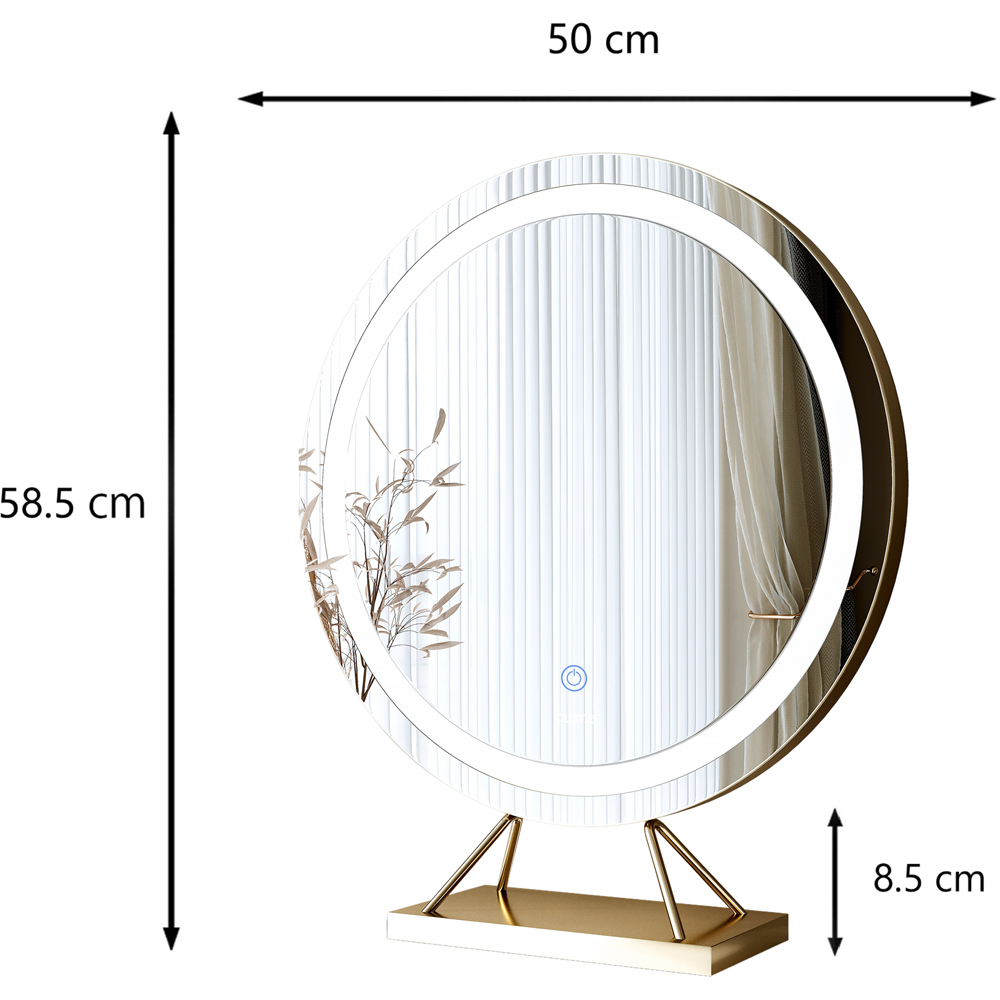 Round Gold Frameless Touch Sensor LED Light Mirror. Circular table top mirror with touch sensor LED light strip. LED light features three different colour settings; warm, cool and daylight. Power source: UK 3-pin BS plug. Compatible with standard UK outlets. For use in other countries, a plug adapter is recommended (not included). Mirror Diameter: 50cm / Overall Dimensions: 50×13.5×58.5(H)cm.
