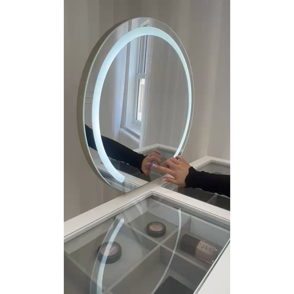 Semi-Round Gold Frameless Touch Sensor LED Mirror; Table Mount / Wall Mount ; 3 colour change. Wall Mounted. LED light features three different colour settings; warm, cool and daylight. Power Source: UK 3-pin BS plug. Compatible with standard UK outlets. For use in other countries, a plug adapter is recommended (not included). Overall Dimensions: 55×52.5(H)cm.