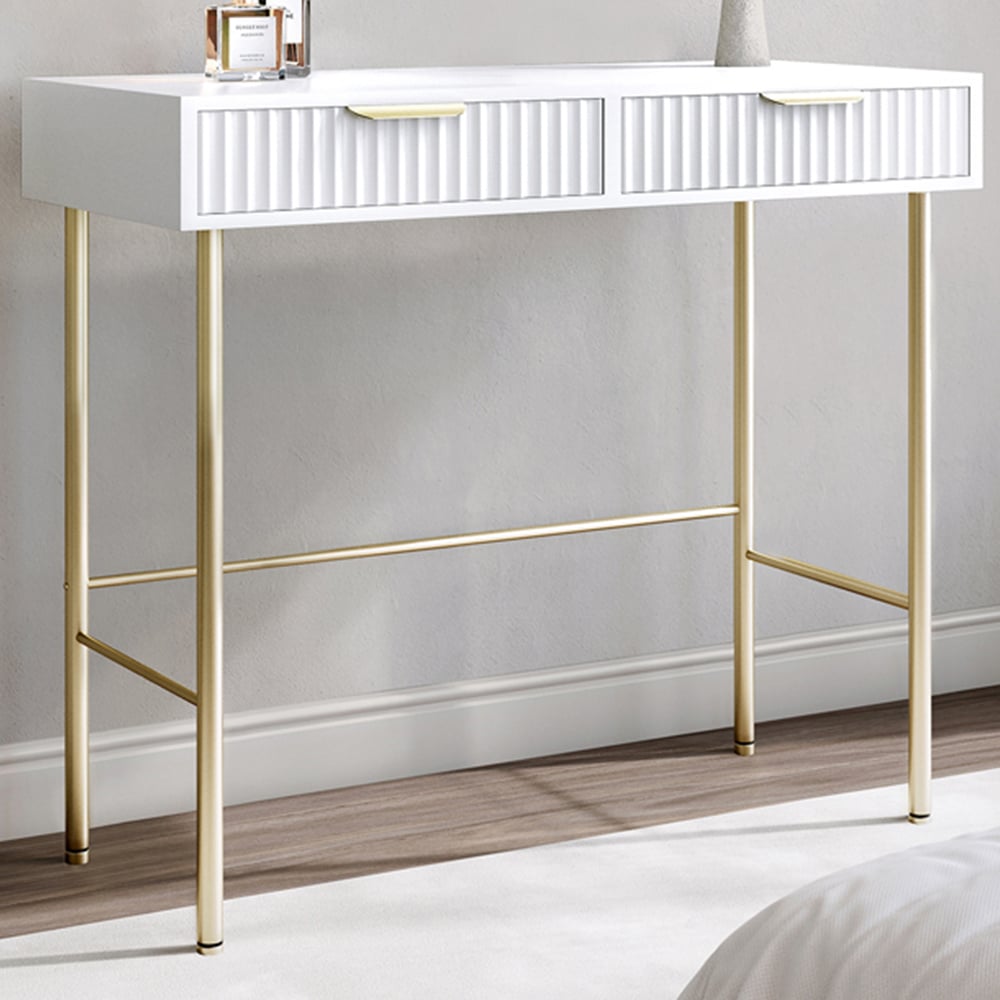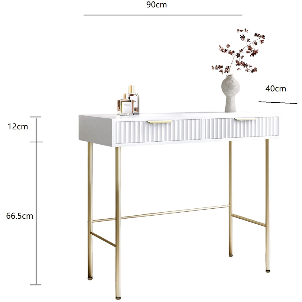 White Dressing Table - 2 Drawers with ribbed front finish and grey velvet lining, Gold handles. Dressing table with two storage drawers. Drawers with ribbed front finish and grey velvet lining. Gold-toned handles and legs. Easily assembled. Overall Dimensions – W90 x D40x H78.5cm.