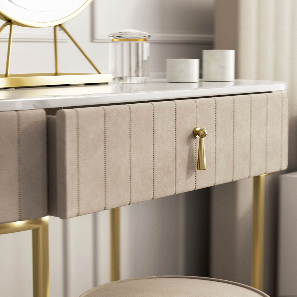 This Makeup Vanity Dressing Table features an upholstered velvet finish with a quilted pattern and a white marble effect tabletop. Each table includes two storage drawers and a matching padded stool. The touch sensor LED mirror is equipped with a dimmable light strip that offers three different colour settings: warm, day, and cool. The dressing tables are easily assembled and powered by a plug-in source. The dimensions are L100 x D40 x H131.5 cm, with the dressing table weighing 18.2 kg, the stool 3.4 kg, and the mirror 2.9 kg.
