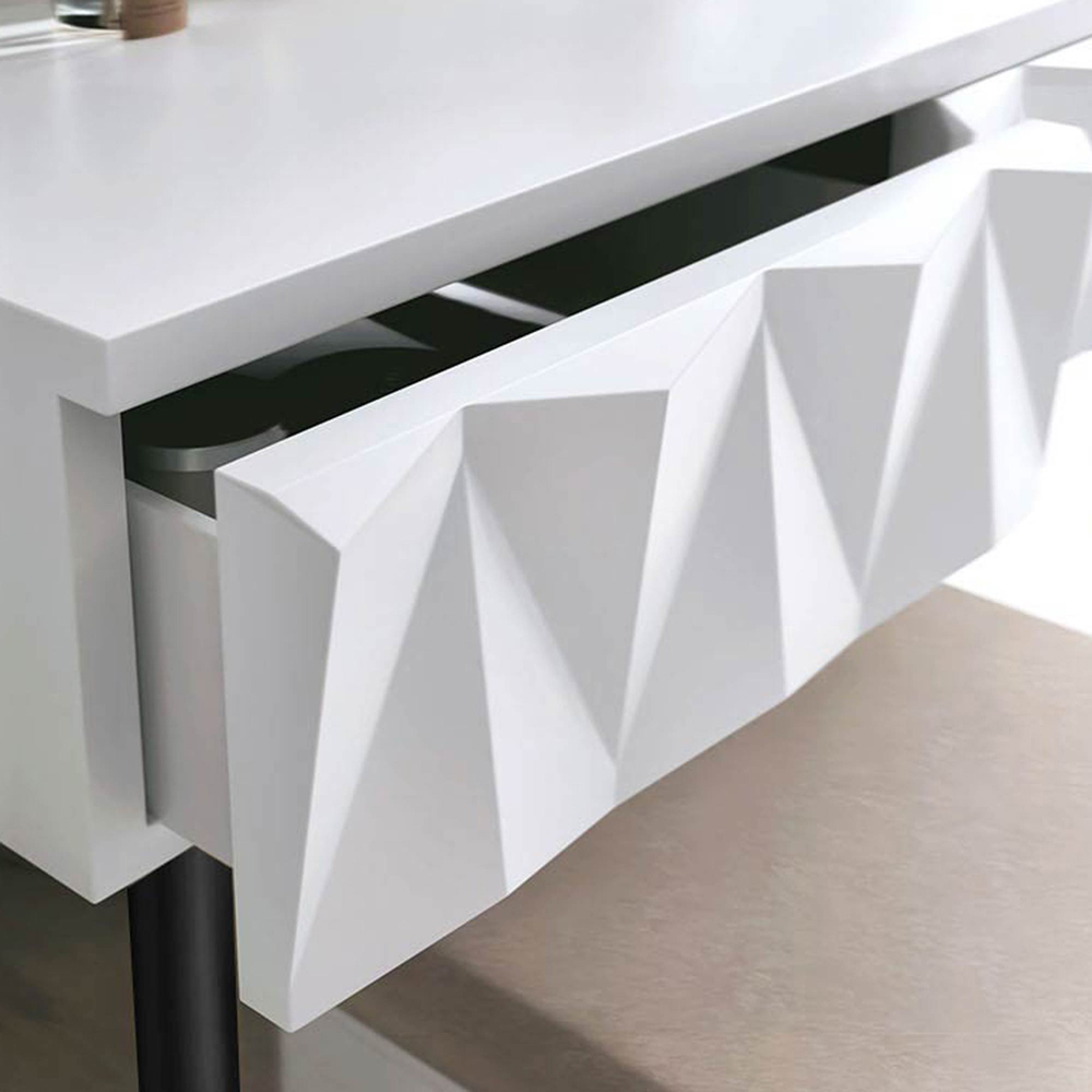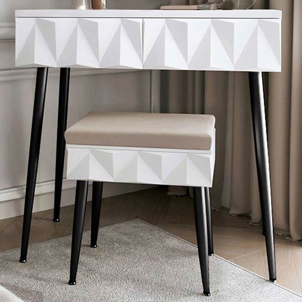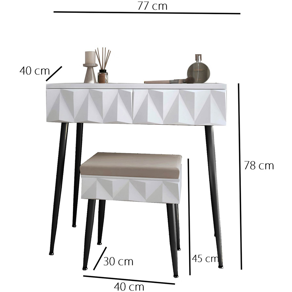 Montana Set of 2 White Vanity Table & Stool set. 2 wave pattern Drawers, matching Padded Storage Stool with Black finish leg. Dressing table complete with two storage drawers and padded stool. Easily assembled. Overall Dimensions – L77 x D40 x H78cm.
