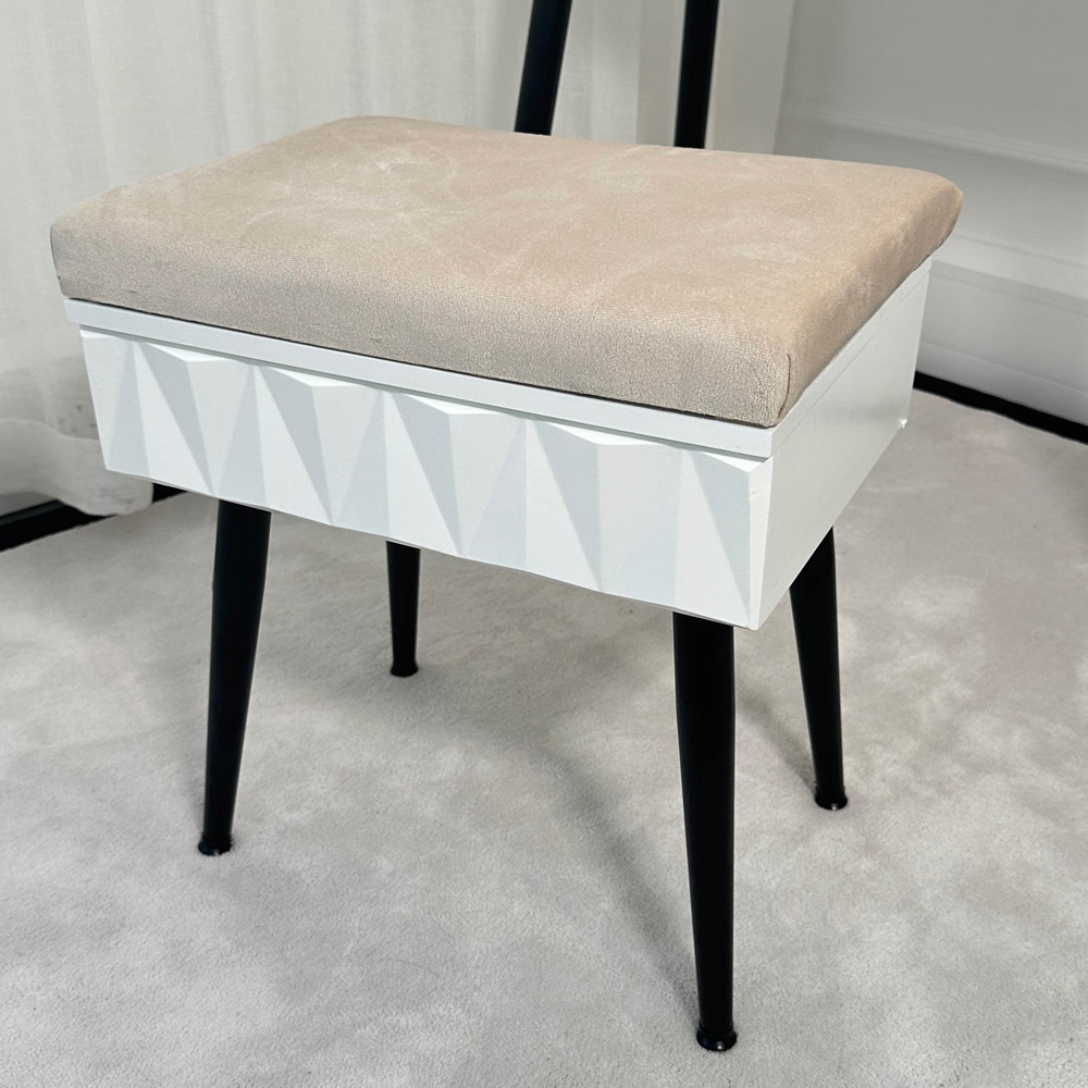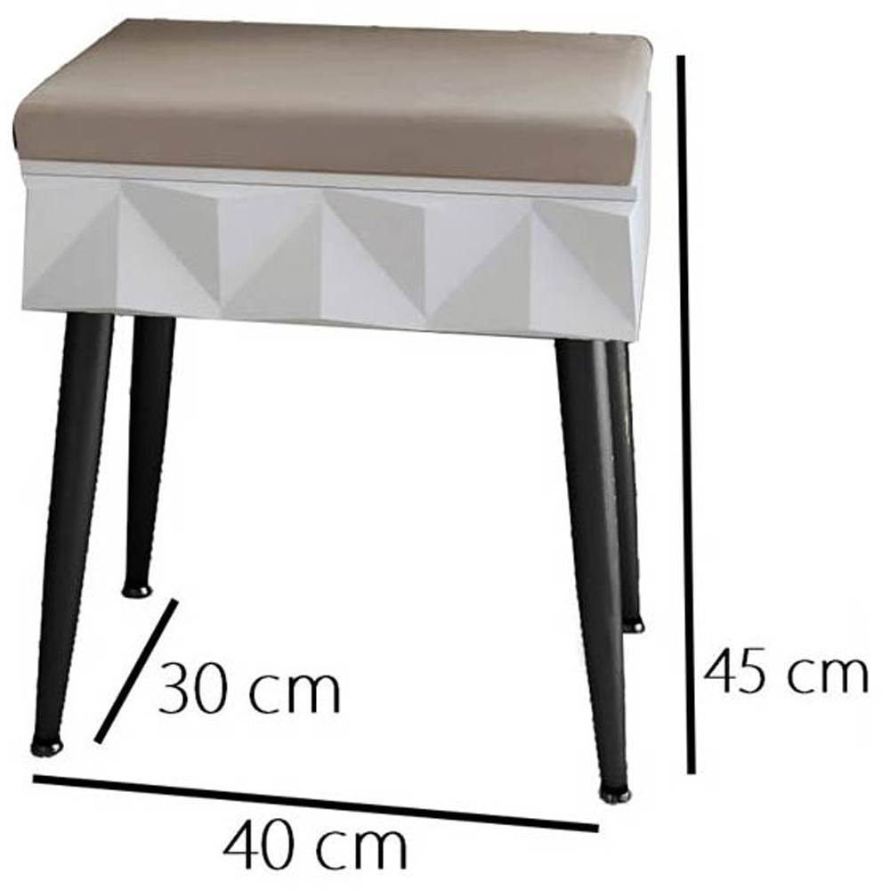 Padded Velvet Storage Stool-White/Black. Padded velvet stool. Lift the seat to reveal a storage compartment. Dimensions: H45cm x W40cm x D30cm.