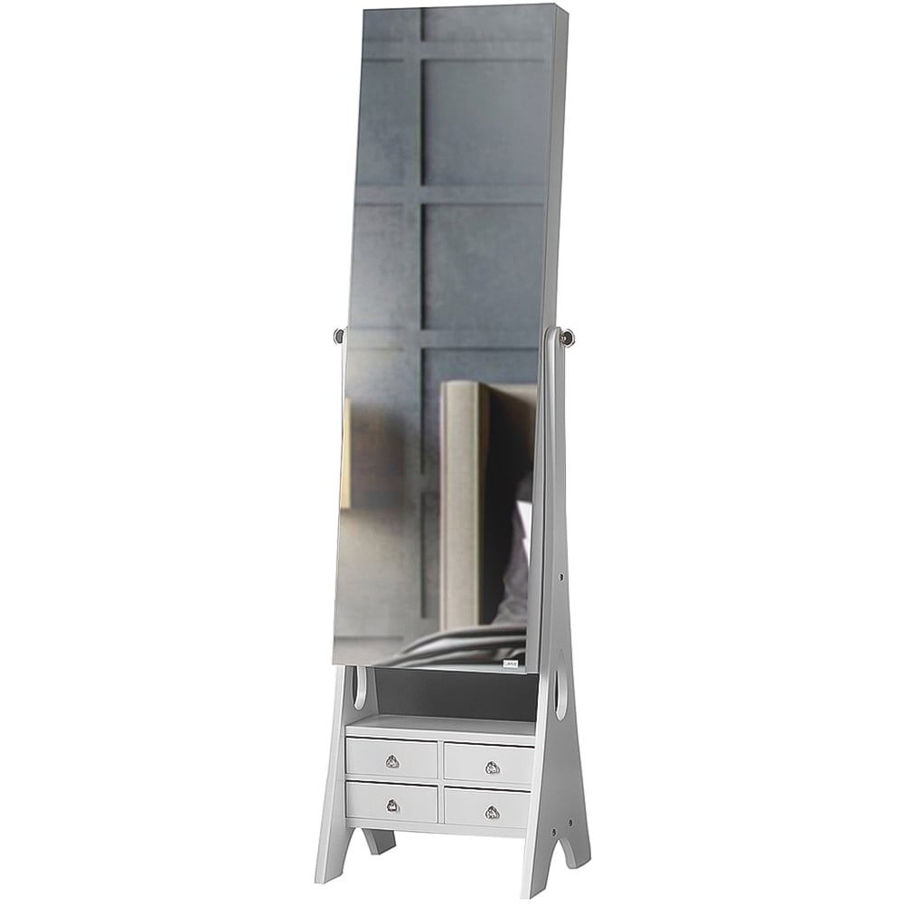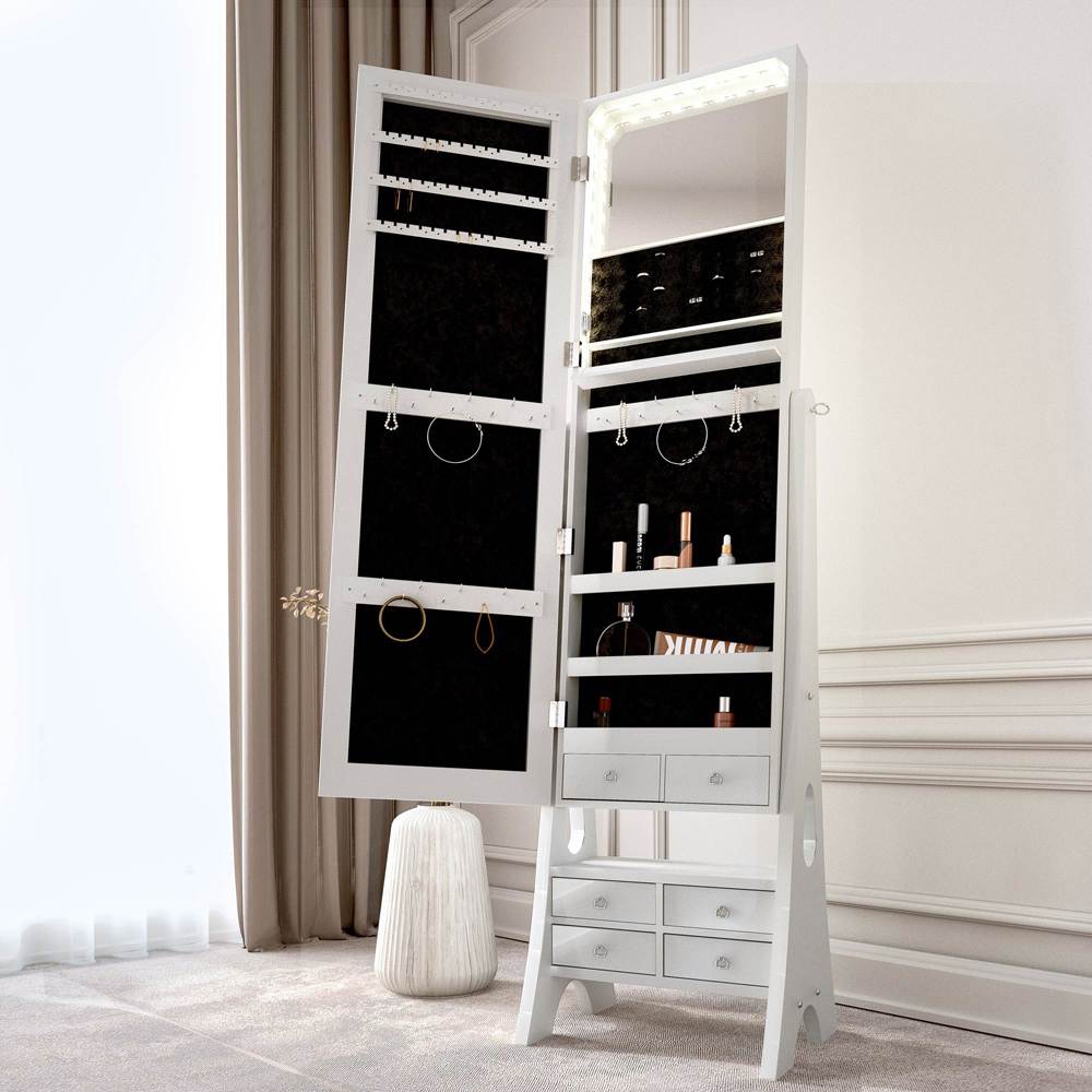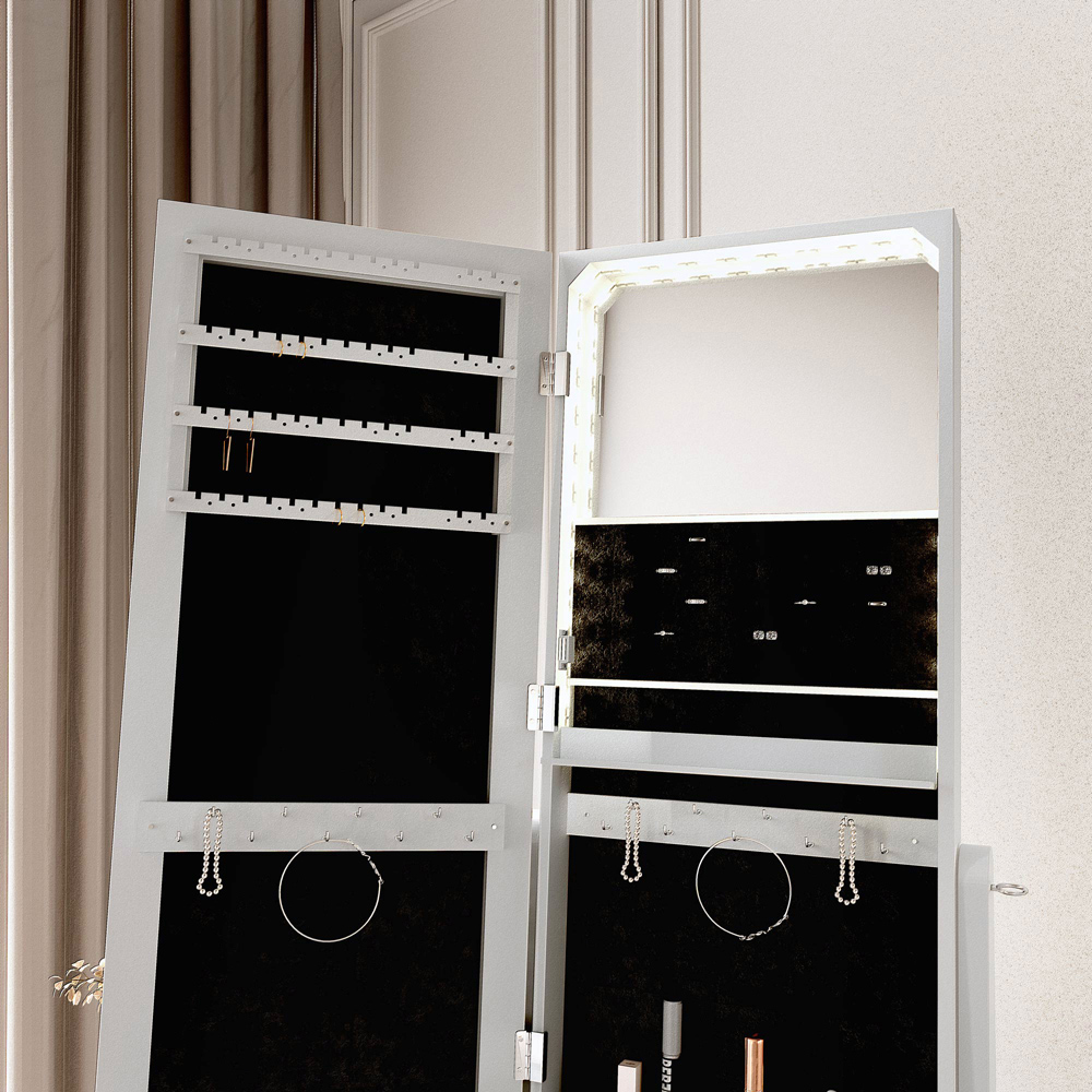 White Full Length Mirror Jewellery Cabinet Free Standing Makeup Storage Organiser; Interior LED Flip light, battery operated.