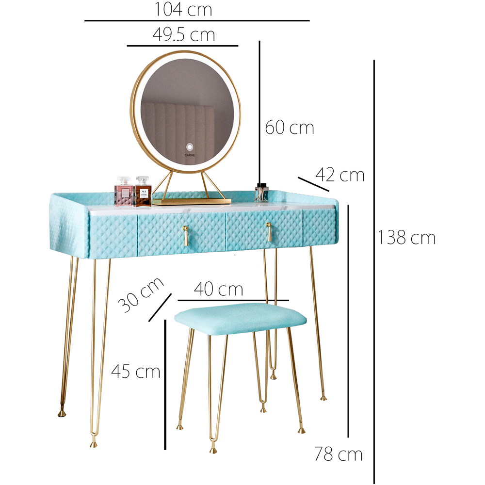 This Baby Blue Makeup Vanity Dressing Table features an upholstered velvet finish and includes 2 storage drawers, a matching padded stool, and an LED touch desktop mirror. The touch sensor circular mirror is illuminated with LED light, offering three dimmable colour settings: warm, day, and cool. The dressing tables have a quilted diamond velvet finish and a white marble effect tabletop, with 2 spacious lined drawers. They are supported by silver hairpin legs with adjustable feet. Each set includes a matching round velvet stool. The dimensions are L104 x D42 x H138cm, with the dressing table weighing 23.6kg, the stool 3.4kg, and the mirror 3.5 kg.