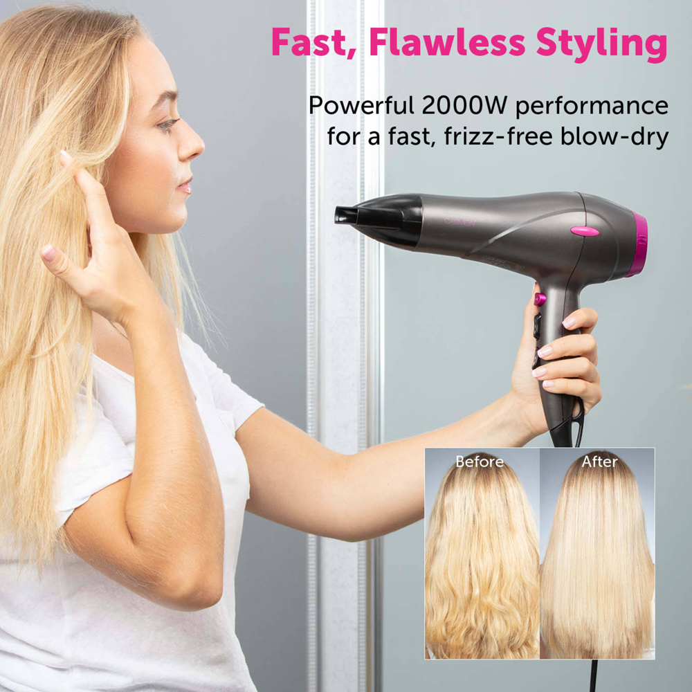 Achieve salon-style hair at home with the Carmen Neon Hair Dryer Set. Its powerful 2000W motor provides fast and frizz-free styling, while the three heat and two speed settings allow you to adjust the intensity that suits your hair type. For precise styling, the concentrator nozzle directs airflow to target areas, allowing you to style your hair professionally. The removable filter makes cleaning the dryer a breeze. With its keratin-infused grille, this blow dryer adds moisture to your hair as you dry, releasing micro-conditioners to protect against heat damage. The other set attachments include a diffuser that helps build volume and eliminates frizz, a paddle brush and a radial brush for finishing touches.