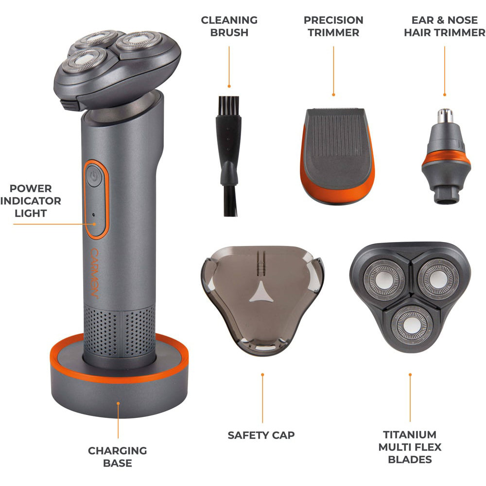 Introduce the ultimate grooming tool to your self-care routine with the Carmen Titan Shaver Set. Engineered with dual-track blades and a flexible cutter, this shaver efficiently cuts hair. Equipped with an advanced rechargeable battery, this shaver provides a 60-minute cordless runtime. The double-track blade covers 50% more surface area than a regular blade, resulting in a quicker shave. With three interchangeable attachments including a nose and ear trimmer, shaver and clippers, you can achieve all-round grooming.