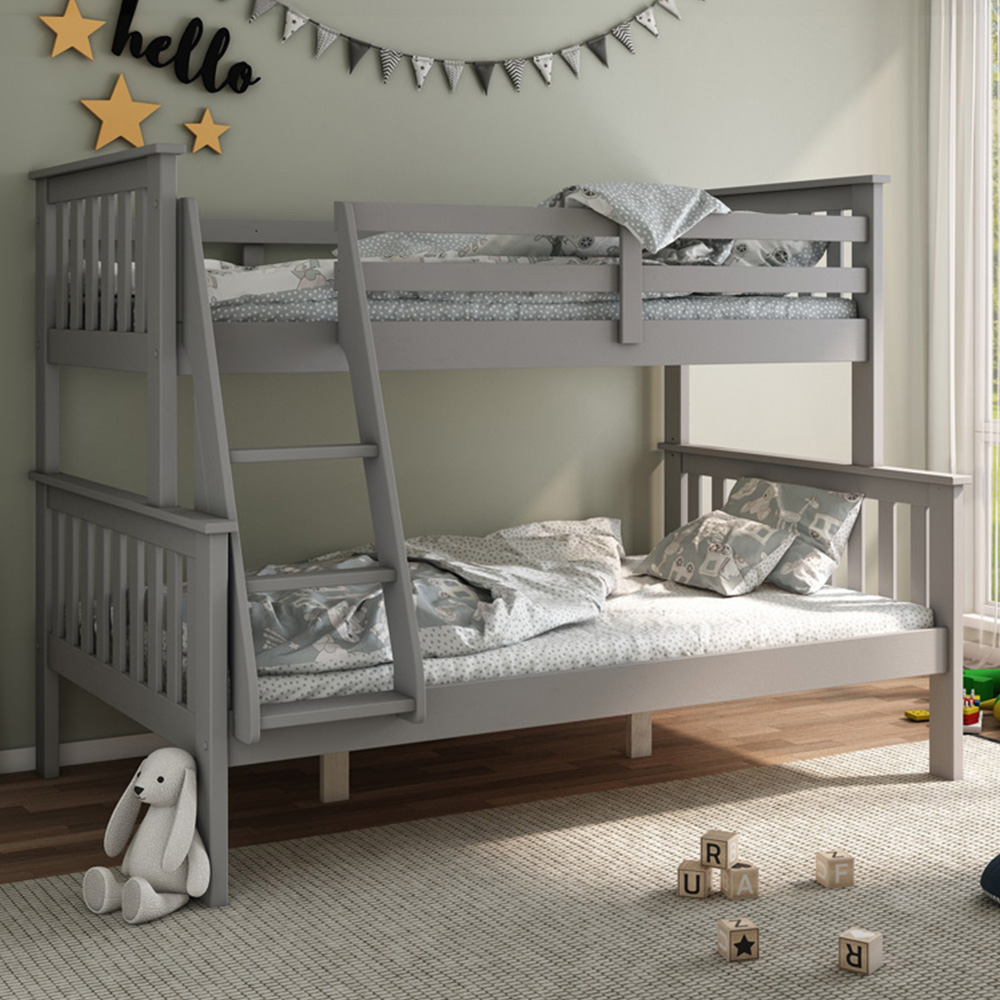 Make a stylish yet functional addition to your space with the Bedmaster Carra Triple Sleeper Grey Bunk Bed. This modern bunk bed is manufactured using quality pinewood with a beautiful lacquered grey finish, which helps retain the fine qualities of the pinewood. Ensuring protection, the bed has four guard rails to the top bunk and two to either side that ensure safety for the top bunk sleeper. Also, the ladder is adjustable to either the left or right-hand side, designed to suit any bedroom requirements. The bed complies with the requirements of UK bunk beds (Entrapment Hazards) (Safety Regulations 1987) and the European Standards (EN747-1). Plus, the headboard and footboard are both styled with vertical slats. his bed can easily be split and used as a separate single and small double bed. Durable and sturdy, the mattresses (not included) are supported by a strong wooden slatted base for extra comfort. Versatile and stylish, it is a perfect option for saving space and is ideal for both adults and children. This product is supplied flat-packed to a room of choice. Please note: Requires adult assembly. The gap between bunks is 67.2cm and the under-bed gap is 28.5cm.