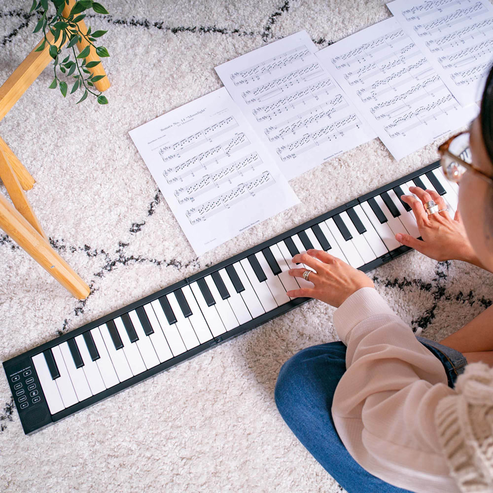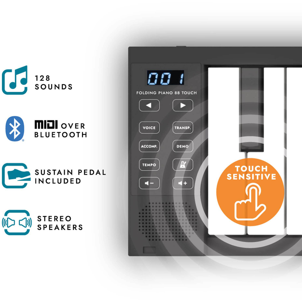 Play your favourite tune with the Carry-On Black 88 Key Folding Piano. It is an ideal companion for aspiring musicians and seasoned players on the move. This remarkable touch sensitive instrument has a clever design and velocity sensitivity which provide a full-size piano experience in a compact and foldable design. It features 88 classic keys, providing an authentic and responsive feel with a soothing sound and up to eight hours of battery life. It includes 128 sounds and accompaniments with MIDI over USB and Bluetooth functions. This folding piano comes with a handy travel bag, pedal and USB cable. This piano weighs only 1.6kg and has a compact size of 33cm when folded up, making it highly portable.