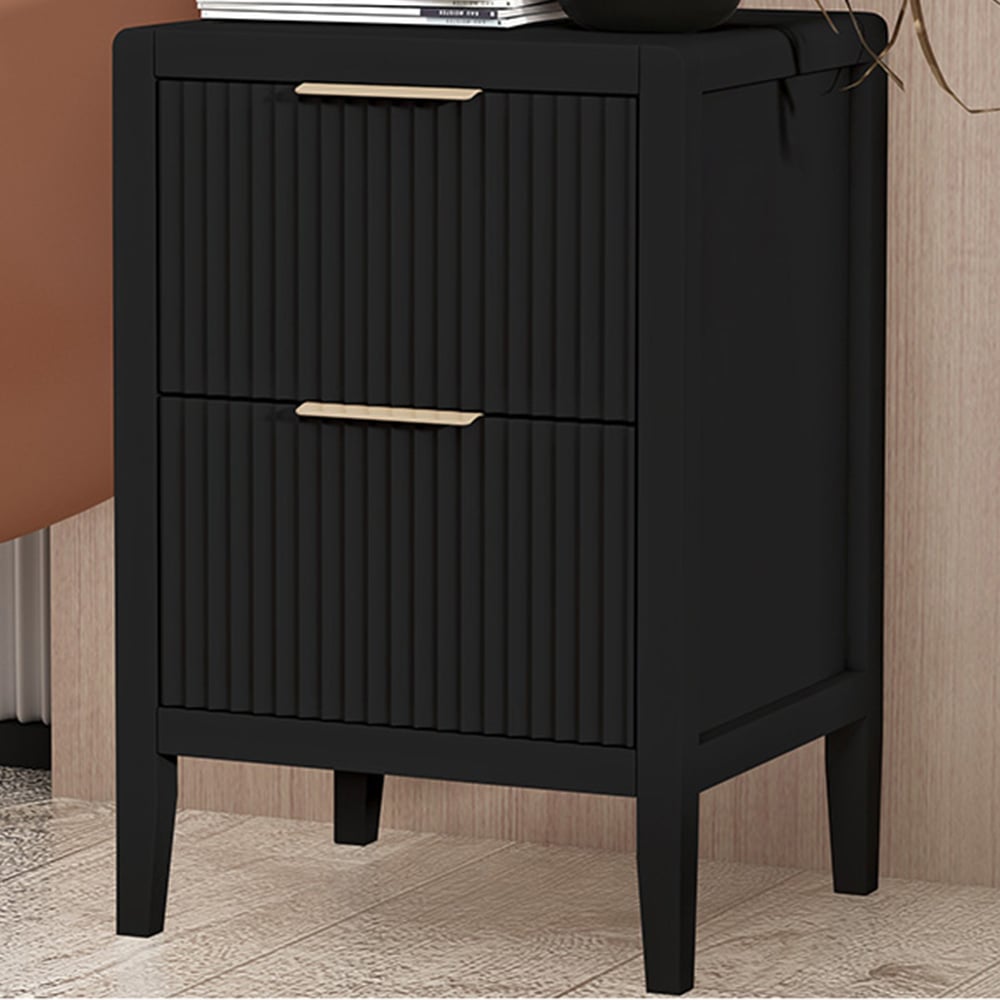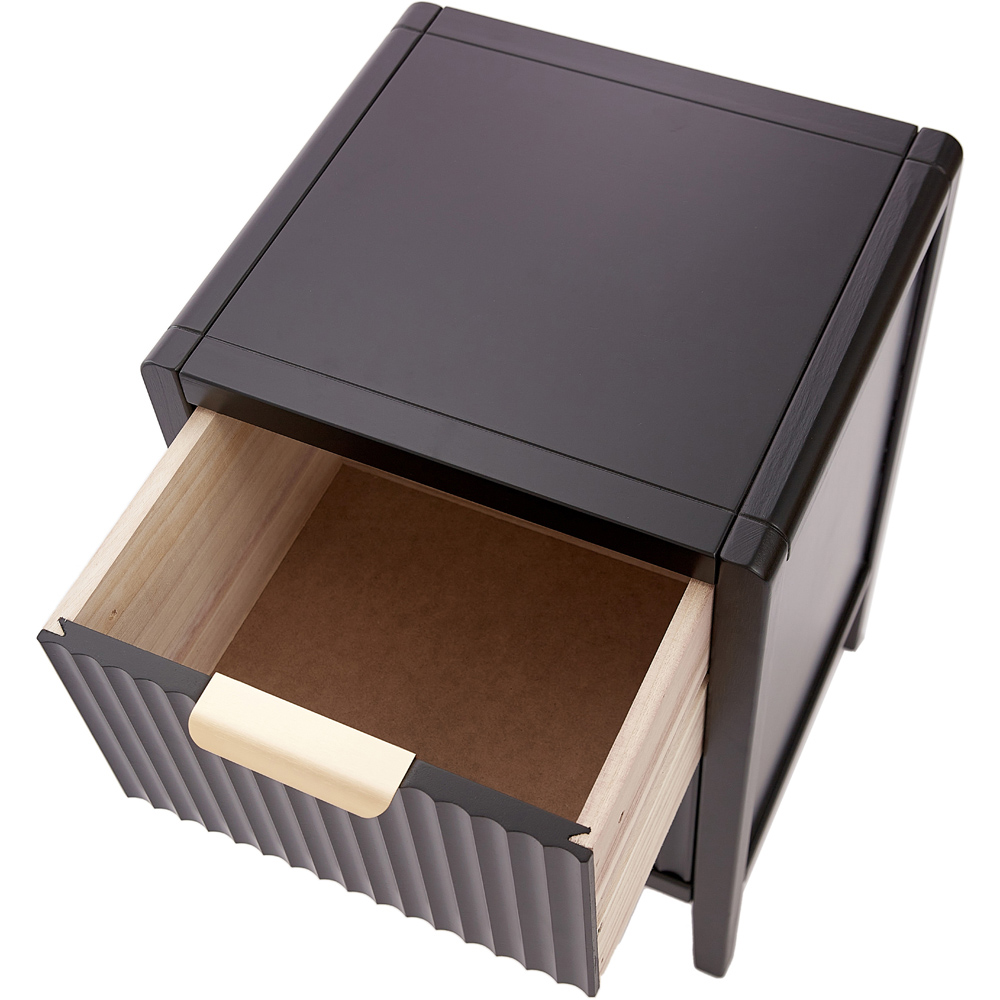 Uplift your bedroom decor in a classy way with this Castel Bedside Table. This black-coloured table features a sophisticated design with a matt finish, which gives this bedside table an outstanding look that can add character to any environment. The table is made with a combination of solid pine wood and textured MDF for a sturdy build. It has two narrow drawers completed with sleek golden metal handles, which makes it very versatile, giving you plenty of space for your valuables. With its classy looks, this bedside table can be the perfect choice to add an eye-catching piece to your bedroom decor. The dimensions of the table are H58 x W39 x D35cm.