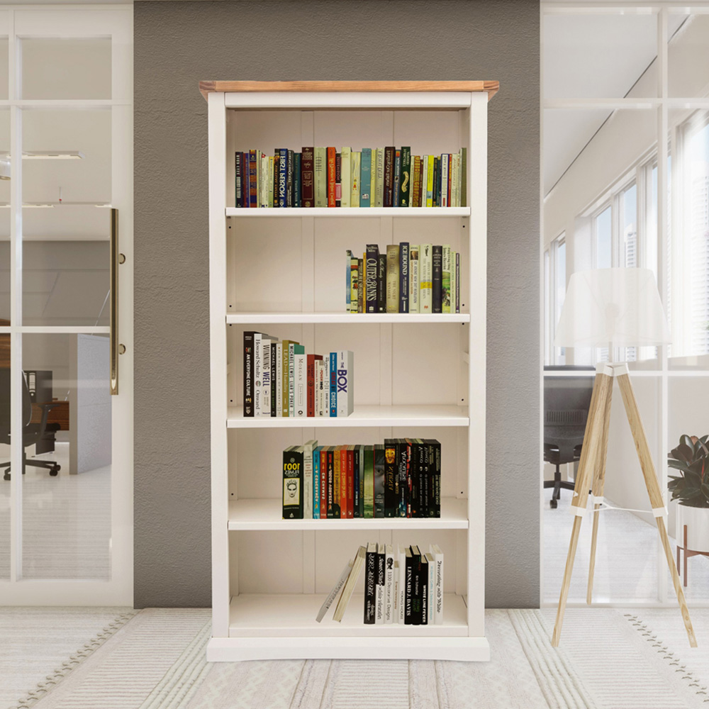 Find the perfect frame for your stories with the Castelli 5 Shelf Off White Bookcase. This elegant bookcase features a simple yet charming design and is carefully crafted by skilled artisans to meet the highest standards. It is made using responsibly sourced wood and veneers, with the tops constructed from a combination of solid pine wood and veneers, hand waxed for a stunning finish. The body is adorned with premium, eco-friendly, water-based paint in a delightful off-white colour. With its five shelves, this stylish, tall bookcase is perfect for organising and displaying your collection of books, CDs, or DVDs. The four central shelves are adjustable, allowing you to customise the space to meet your specific needs. The top shelf is ideal for showcasing a favourite photograph or a lovely houseplant. Its simple assembly and exceptional value make it the perfect addition to your home. Dimension: 180 x 90 x 30cm.