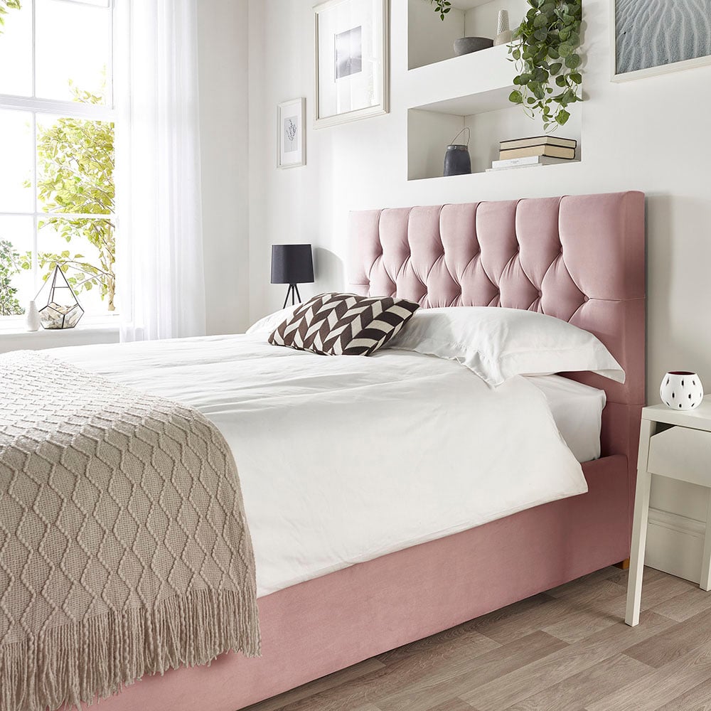 Add comfort and style to your bedrooms with this Catherine Lansfield Boutique Blush Velvet Ottoman Bed. This ottoman bed is manufactured in the UK and upholstered in a beautiful, brushed velvet fabric. The hand-upholstered headboard features deep padding and a gorgeous, Chesterfield-inspired headboard design with handmade button detailing. Also, finished in a blush velvet fabric and stylish solid hardwood feet, it makes a super-elegant addition to any space. This ottoman bed provides vast storage with gas lift pistons - this mechanism will hold the bed's position in place, allowing hands-free access to the large storage area. For added convenience, the bed comes complete with a dust sheet to keep the storage area clean. Plus, the bed includes quality spring slats for added comfort and support. Size: Double. Please note: The storage area is not a boarded base and the mechanism is capable of lifting a mattress with a weight of up to 60kg. This bed is supplied flat pack, assembly takes one to two hours and is easier with two people. Moreover, it meets UK safety standards and has also passed non-mandatory structural testing for peace of mind. The bedding in the image is only for illustration purposes.