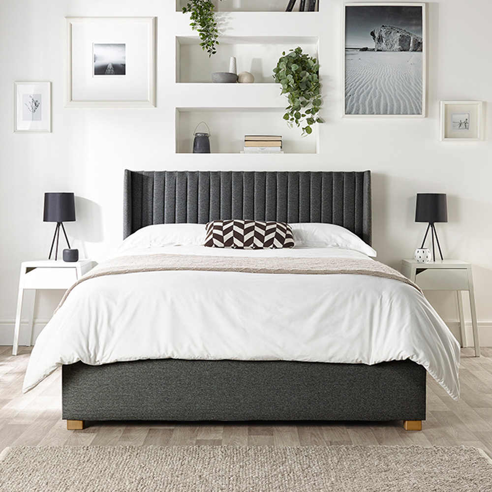 Transform your bedroom space with this Catherine Lansfield Soho Charcoal Twill Ottoman Wing Bed. This ottoman bed is manufactured in the UK and upholstered in a beautiful and hard-wearing twill fabric. The hand-upholstered headboard features deep padding and a gorgeous, winged headboard with a contemporary buttoned design. Also, finished in a charcoal-coloured fabric and stylish solid hardwood feet, it makes a super-elegant addition to any space. This ottoman bed provides vast storage with gas lift pistons - this mechanism will hold the bed's position in place, allowing hands-free access to the large storage area. For added convenience, the bed comes complete with a dust sheet to keep the storage area clean. Plus, the bed includes quality spring slats for added comfort and support. Size: Small Double. Please note: The storage area is not a boarded base. The mechanism is capable of lifting a mattress with a weight of up to 60kg. This bed is supplied flat pack, assembly takes one to two hours and is easier with two people. Lastly, it meets UK safety standards and has also passed non-mandatory structural testing for peace of mind.