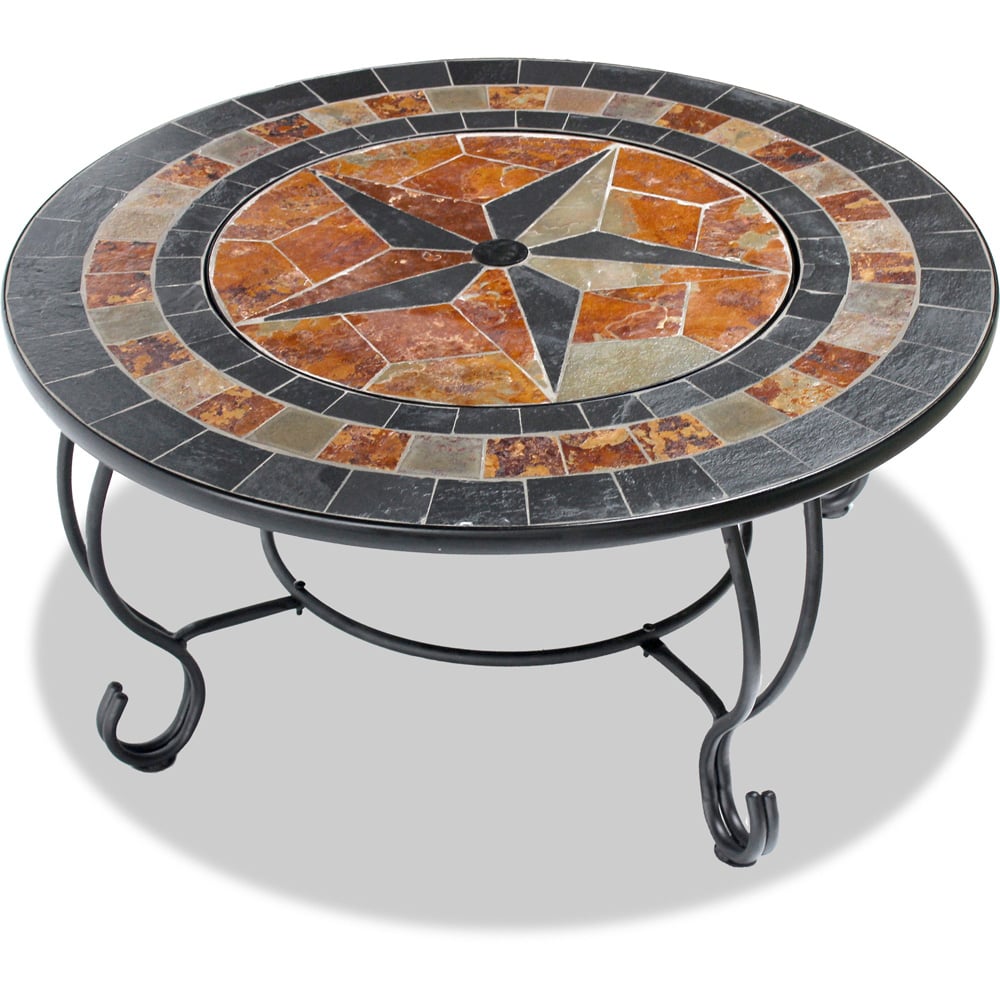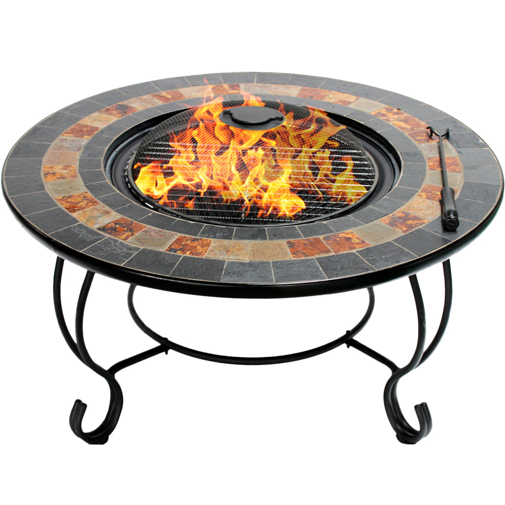 A high-end deluxe design with a round frame, the Dakota fire pit is practical and convenient and can be used with charcoal, logs, coal and wood. Beautifully completed with intricate brick red and charcoal slate tiles, it is perfect for providing warmth in a garden, yard, patio, terrace, or similar areas. The Dakota is a clever multi-function 4 in 1 Fire Pit - it can be used as a Fire Pit / Table / Barbeque / Ice Bucket (To use as an Ice Bucket, line the pit with plastic to stop water from escaping). The safety mesh lid allows you to watch the burning fire, encloses the fire for safety and prevents sparks and debris from flying out. The poker tool can be used for both removing the mesh cover and rearranging the logs or coal. For your convenience, the following accessories are included: poker tool, barbeque grill, safety mesh lid, charcoal rack, clear and concise instructions for easy self-assembly, and waterproof protective cover to protect it from dust, leaves and rain. Made of steel, the Dakota's elegant yet heavy-duty Italian-influenced legs make it strong and sturdy. Additionally, it is durable and rust-resistant with a heat-proof frame and a black powder-coated iron bowl. Dimensions: Diameter: 80cm x Height: 42cm.