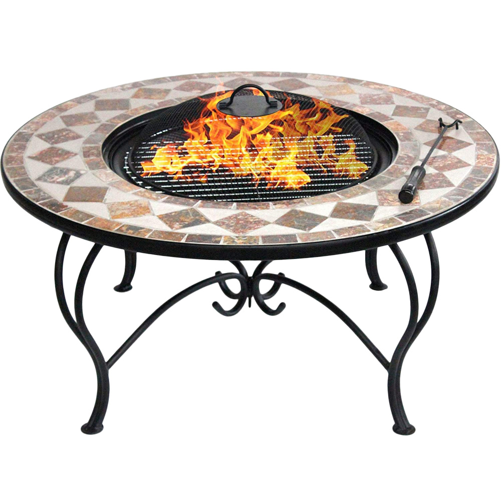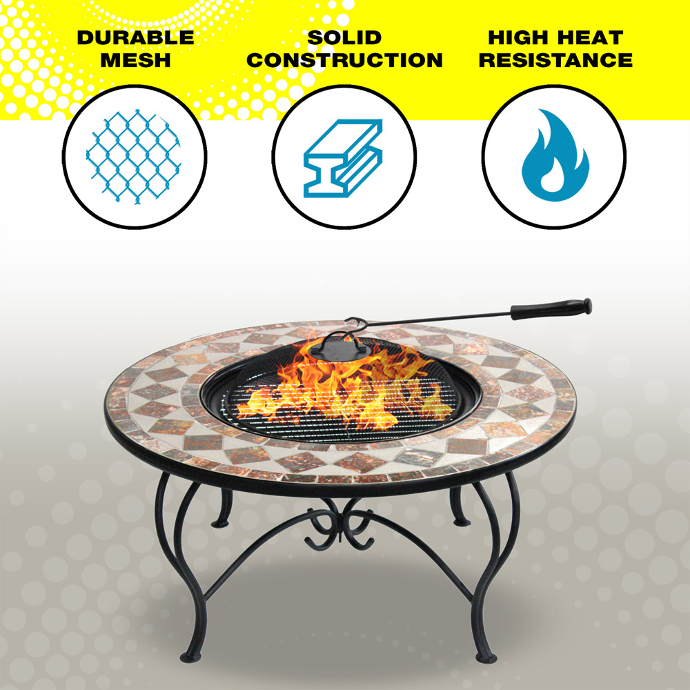 An extravagant design with a round frame, the Kennocha fire pit is practical and convenient and can be used with charcoal, logs, coal and wood. Beautifully completed with intricate cream and pale brown detailed marble tiles, the Kennocha charcoal fire pit is perfect for providing warmth in a garden, yard, patio, terrace, or similar areas. The Kennocha is a clever multi-function 4 in 1 Fire Pit - it can be used as a Fire Pit / Table / Barbeque / Ice Bucket (To use as an Ice Bucket, line the pit with plastic to stop water escaping). The safety mesh lid allows you to watch the burning fire, encloses the fire for safety and prevents sparks and debris from flying out. The poker tool can be used for both removing the mesh cover and rearranging the logs or coal. For your convenience, the following accessories are included with the Kennocha outdoor fire pit: poker tool, barbeque grill, safety mesh lid, charcoal rack, clear and concise instructions for easy self-assembly, waterproof protective cover to protect it from dust, leaves and rain. Made of steel, the Kennocha's elegant yet heavy duty Italian influenced legs make it strong and sturdy. Additionally, it is durable and rust resistant with a heat proof frame and a black powder coated iron bowl. Dimensions: Diameter - 80cm x Height - 42cm.