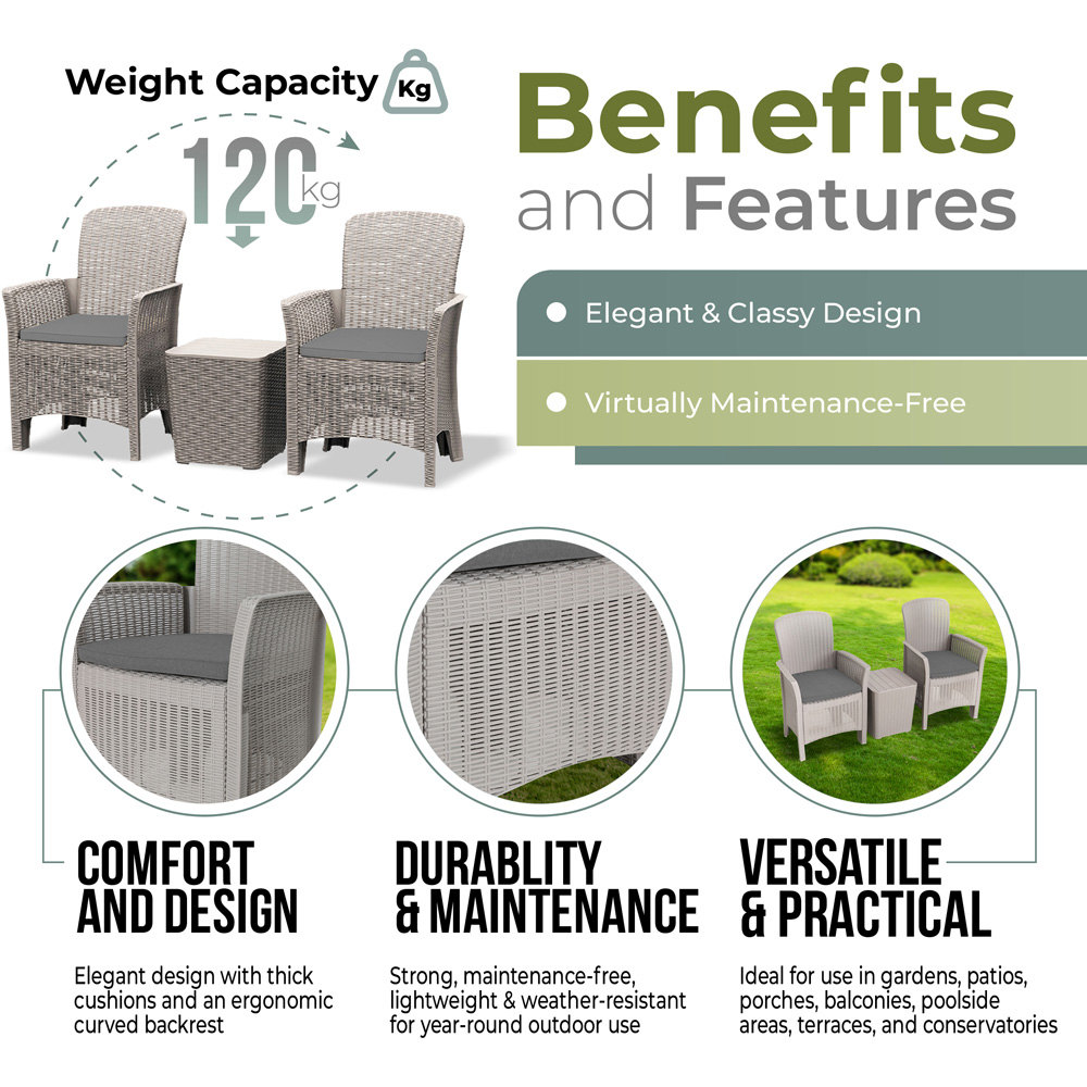 With its elegant design, the Ophelia High Back Armchair set is both practical and convenient and perfect for maximising any space. It comprises two single armchairs and a coffee table. Complementing the stylish design, the thick padded cushions and the ergonomically curved backrest of the Ophelia lounge set provide a comfortable seating experience, allowing you the peace of mind to sit back and enjoy. The Side Table also has a hidden compartment accessible by lifting the table top offering a convenient storage area for all your necessities. The Ophelia outdoor seating set is suitable for use in most environments 365 days a year, whether it be in a garden, patio, porch, balcony, poolside, terrace or conservatory. Made of high-quality polyurethane resin, the Ophelia garden seating set is stronger yet lighter and easier to move than traditional rattan. It is virtually maintenance-free and easy to keep clean. With durability in mind, the hardwearing Ophelia set is designed to be left outside all year round and be resistant to most types of extreme weather, whether it be the summer sunlight or winter snow. Its long life span means it will not need replacing every few years like wood or other materials. Dimensions: Single Armchair: Width: 62.0cm x Depth: 67.0cm x Height: 90.0cm / Coffee Table: Width: 39.0cm x Length: 39.0cm x Height: 42.0cm. The Ophelia outdoor furniture comes flat-packed, complete with a 1-Year Manufacturer's Warranty.