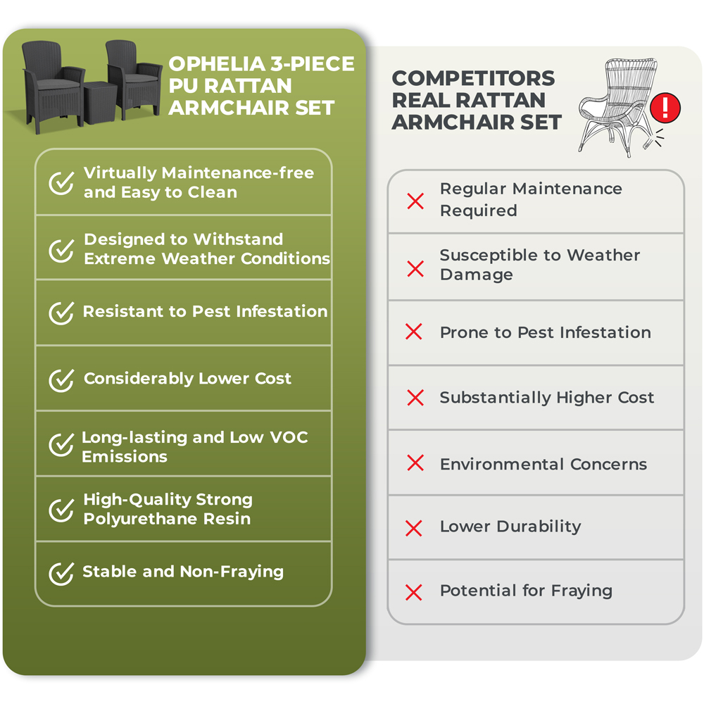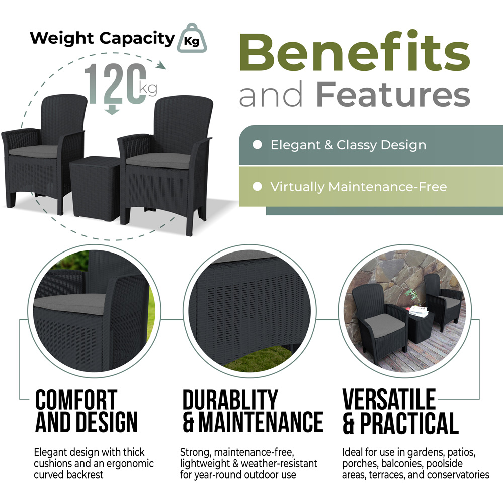 With its elegant design, the Ophelia High Back Armchair set is both practical and convenient and perfect for maximising any space. It comprises two single armchairs and a coffee table. Complementing the stylish design, the thick padded cushions and the ergonomically curved backrest of the Ophelia lounge set provide a comfortable seating experience, allowing you the peace of mind to sit back and enjoy. The Side Table also has a hidden compartment accessible by lifting the table top offering a convenient storage area for all your necessities. The Ophelia outdoor seating set is suitable for use in most environments 365 days a year, whether it be in a garden, patio, porch, balcony, poolside, terrace or conservatory. Made of high-quality polyurethane resin, the Ophelia garden seating set is stronger yet lighter and easier to move than traditional rattan. It is virtually maintenance-free and easy to keep clean. With durability in mind, the hardwearing Ophelia set is designed to be left outside all year round and be resistant to most types of extreme weather, whether it be the summer sunlight or winter snow. Its long life span means it will not need replacing every few years like wood or other materials. Dimensions: Single Armchair: Width: 62.0cm x Depth: 67.0cm x Height: 90.0cm / Coffee Table: Width: 39.0cm x Length: 39.0cm x Height: 42.0cm. The Ophelia outdoor furniture comes flat-packed, complete with a 1-Year Manufacturer's Warranty.