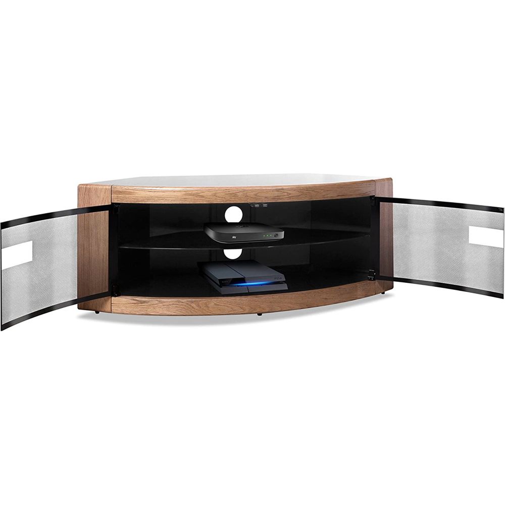Suitable for TV screens up to 50", the Pangea TV cabinet is a stand for any corner. It caters to most home cinema systems, Blu-ray players, Sky/ Virgin/ BT receivers, amplifiers, digital boxes and game consoles with two large shelves offering ample storage. Designed to wrap into any corner, the Pangea TV stand has matching smooth curved edges for creating a contemporary minimalist look. The rear panel comes with generous ventilation to disperse any excess heat accumulated from your equipment. Finished in gloss black and complemented with black top glass and two glass Beam-Thru swing doors with infrared compatibility, the Pangea TV unit maintains a very sleek appearance whilst hiding away equipment from view. The Pangea cabinet comes complete with cable management to hide unsightly wires at the rear and a clear and concise manual for easy self-assembly. Dimensions: Width: 118cm x Depth: 45cm x Height: 45cm / Maximum Top Load Weight: 60kg.