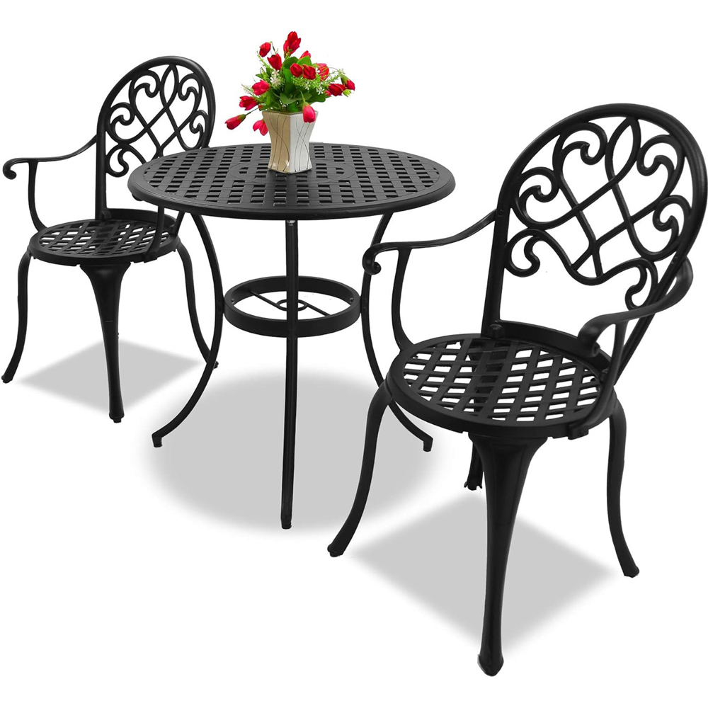 With its sumptuous design, the Prego bistro set is practical, convenient and perfect for maximising any space. It is perfect for any garden, patio, terrace, decking, balcony, lawn, yard or similar areas, and adds a touch of elegance wherever it sits. The Prego is a 3-piece bistro set featuring 2-high-backed large chairs with armrests and a matching table. It promotes a decorative French-influenced design, with decorative chairs and table top. Made from no-rust cast aluminium, the Prego outdoor bistro furniture is strong yet lighter and easier to move than the traditional cast iron predecessor. It is low maintenance and easy to keep clean, it has been powder coated for durability and comes complete with rubber pads for steadiness. With durability in mind, the hardwearing Prego garden bistro set is designed to be left outside all year and be resistant to most types of extreme weather. Its long life span means it will not need replacing every few years like wood, plastic and other materials, and will not rot or rust. The Prego table and chairs set comes flat-packed with simple and easy-to-follow home assembly instructions. Each Chair measures as follows: Width: 45cm x Depth: 47cm x Height: 89.0cm / Weight capacity: 130kg. The Table measures as follows: Diameter: 70.5cm x Height: 70.0cm / Weight capacity: 50kg. The Prego bistro set comes complete with a 1-Year Manufacturers Warranty included.