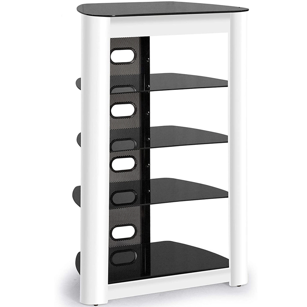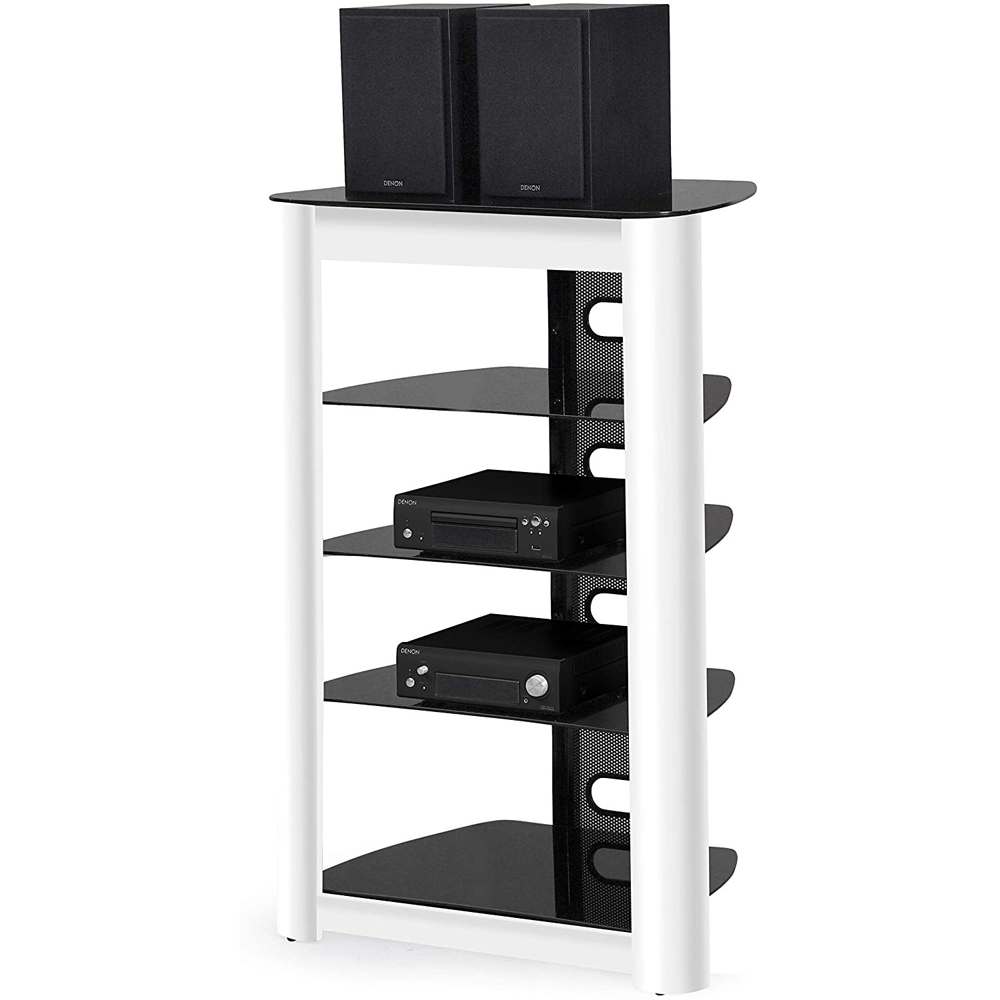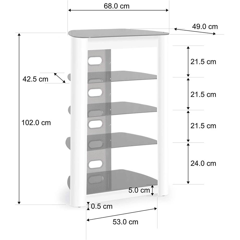 With a perfect blend of modern design, durability, and practicality, the Centurion Supports Zinnia 5 Tier Black Glass Shelves AV Rack will transform your home entertainment experience. Featuring sleek black glass shelves and a gloss white fascia, this premium AV stand is built to complement any living room, home theatre, or gaming space. Whether you need a stylish media unit for your TV, Hi-Fi system, or gaming consoles, the Zinnia offers a sophisticated and space-saving solution. Designed with strength and stability in mind, the multimedia stand boasts a sturdy metal frame that ensures long-lasting durability. The toughened safety glass shelves (BS6206A certified) adhere to British safety standards, providing reliable support for your valuable AV equipment. The polished, curved edges enhance its sleek appearance while ensuring added safety for children and pets. This spacious five-tier AV rack accommodates 15 to 26inches TVs, Hi-Fi separates, home cinema systems, Blu-ray players, Sky, Virgin, and BT receivers, digital boxes, and games consoles. The open-shelf design allows for maximum airflow, keeping your electronic devices cool while in use, preventing overheating, and extending their lifespan. Say goodbye to messy cables! The ZINNIA entertainment stand includes a built-in cable management system, keeping unsightly wires neatly tucked away for a clean and organised look. Plus, with an easy-to-follow assembly guide, setting up your new AV unit is quick and hassle-free. Shelf Dimensions: Width: 68cm. Depth: 49 cm. Height: 102cm. Glass thickness: 6mm top shelf, 5mm other shelves.