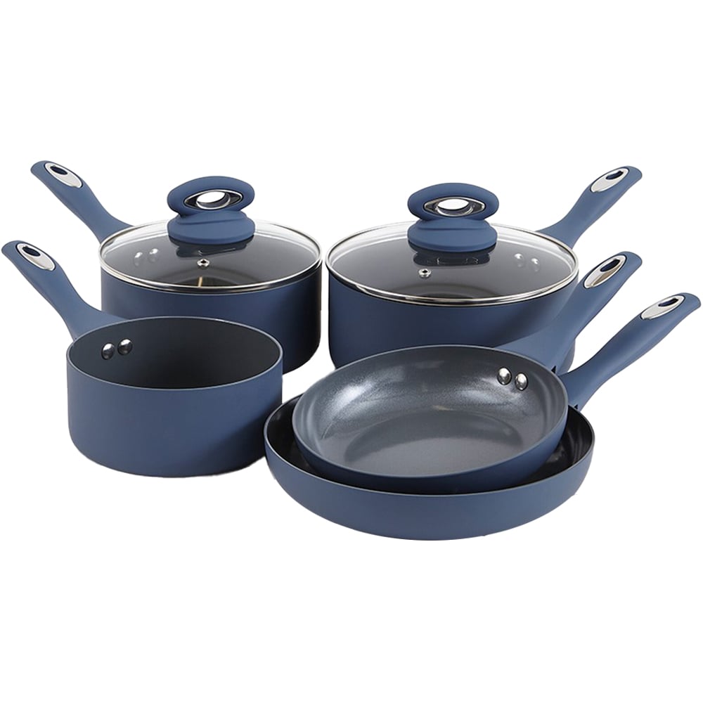 Unlock culinary possibilities with the Cermalon Blue Non Stick Aluminium Cookware Set. Made from pressed and forged aluminium, the five-piece set is tough but still retains a lightweight and adds a little grace to preparing meals. The set features a ceramic silver sparkle non-stick coating that ensures healthier cooking without the need for oils and fats. The exterior matches perfectly with the soft-touch bakelite handles and lid knobs. PTFE and PFOA-free, these pans are dishwasher safe and suitable for all hobs, including induction. This set includes a milk pan, medium and large saucepan with tempered glass lids, small frying pan and medium frying pan.