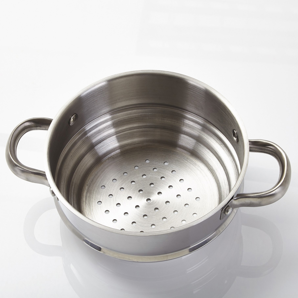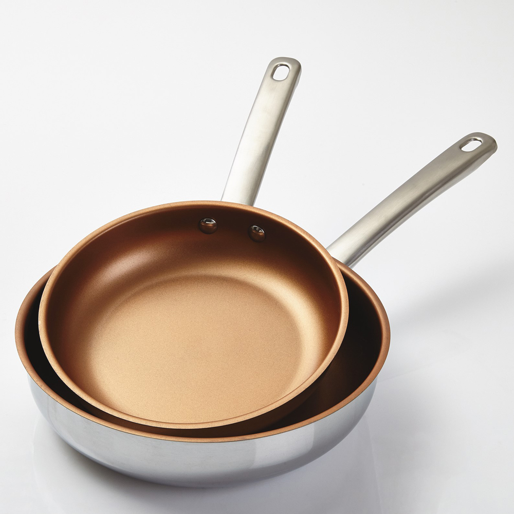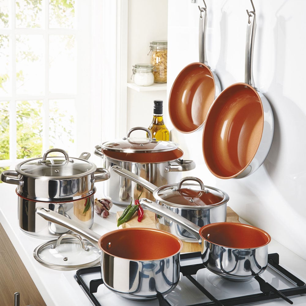 Unlock culinary possibilities with the Cermalon Non Stick Stainless Steel Cookware Set. This eight-piece set is the perfect solution for any menu or number of guests. The pans are made of polished stainless steel with easy-grip ergonomic handles and feature a copper coating for unbeatable style and ultimate non-stick cooking performance. Plus, you can have peace of mind knowing that the pans are PFOA-free and suitable for all hob types. A must-have for any serious chef's kitchen, this set comes in a colour presentation box with an easy-carry handle. This set includes a 14cm milk pan without a lid, a 16cm saucepan with a glass lid, an 18cm casserole with a glass lid, a 20cm saucepan with a glass lid, 20cm and 24cm frying pans, universal steamer and 12cm jug.