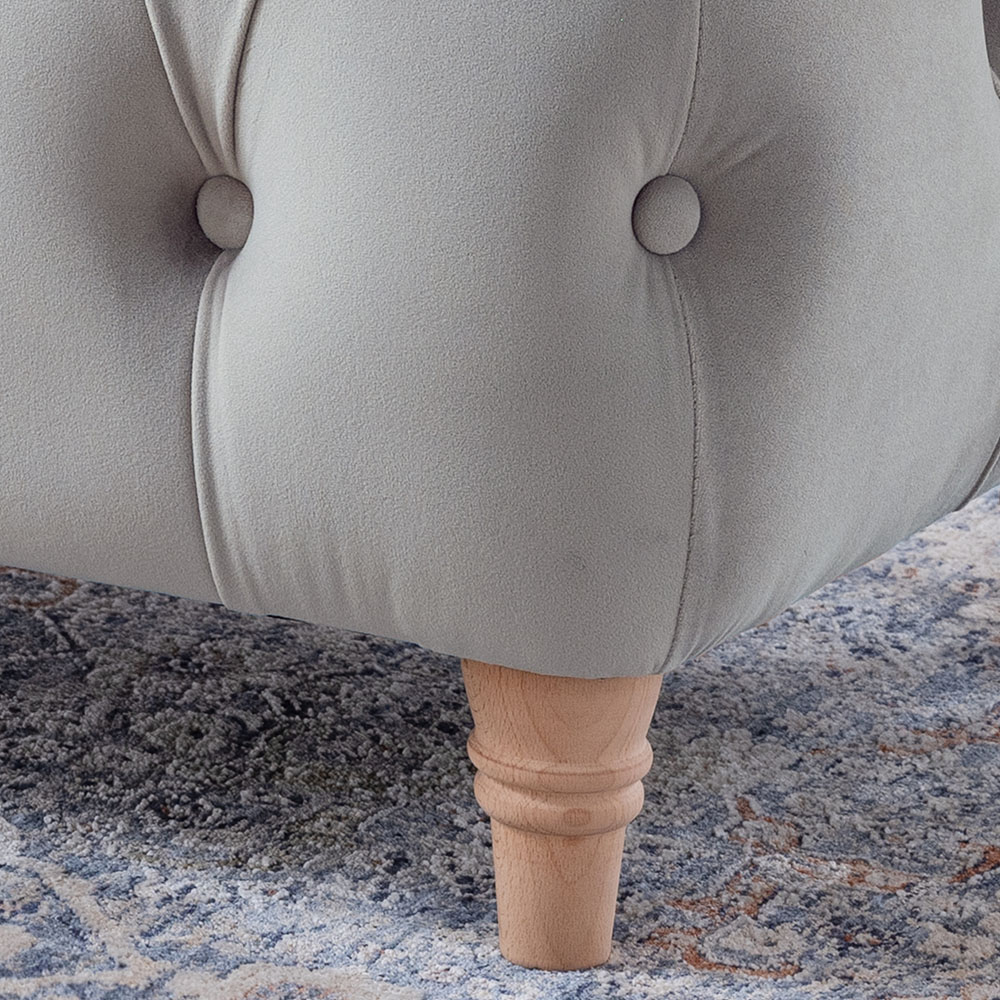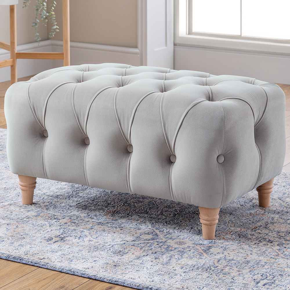 Elevate your home's decor with this Chalk Velvet Footstool. It features a pocket spring interior core topped with feathers and fibre for extra comfort. Plump and sumptuous, it's adorned with a soft touch, crush resistant velvet. It also flaunts a deep hand-buttoning design to add a touch of charm to your space. With this stylish footstool, enhance your living space ambience effortlessly.