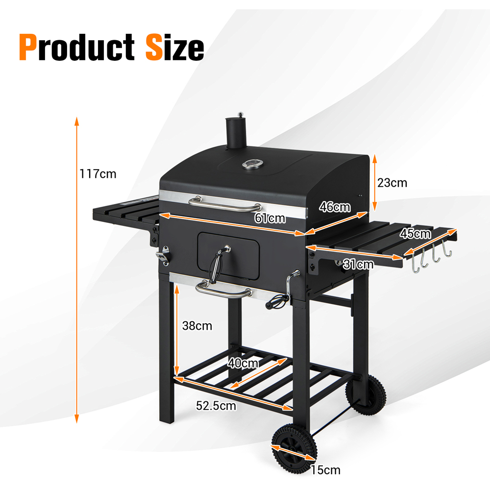 Enhance your outdoor cooking experience with the Costway Charcoal BBQ Grill with Foldable Side Tables, perfect for backyard BBQ parties, family gatherings, picnics, and more. Features a spacious cooking area with a 391 sq.in. grill and a 220 sq.in. warming rack. Equipped with two foldable side tables, eight hooks, and a large bottom shelf, it keeps all your BBQ essentials within reach. The front charcoal entry port with a cool-touch handle, adjustable chimney, and two side air vents ensure proper ventilation and heat regulation. The lid-mounted temperature gauge allows for real-time heat monitoring, while the height-adjustable charcoal tray offers customised cooking. The grill's convenient design includes a bottom pull-out ash tray for easy cleaning and rustproof electroplated grilling grates, making it a practical and enjoyable addition to any outdoor setting.
