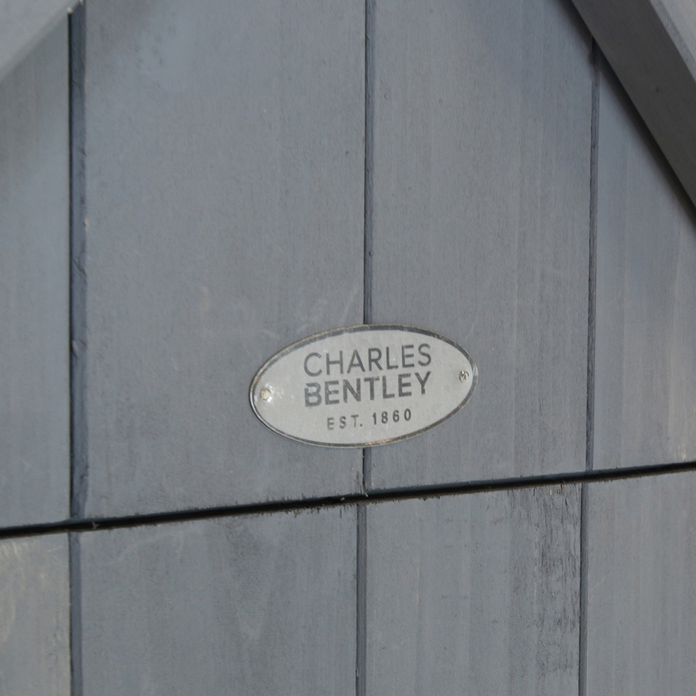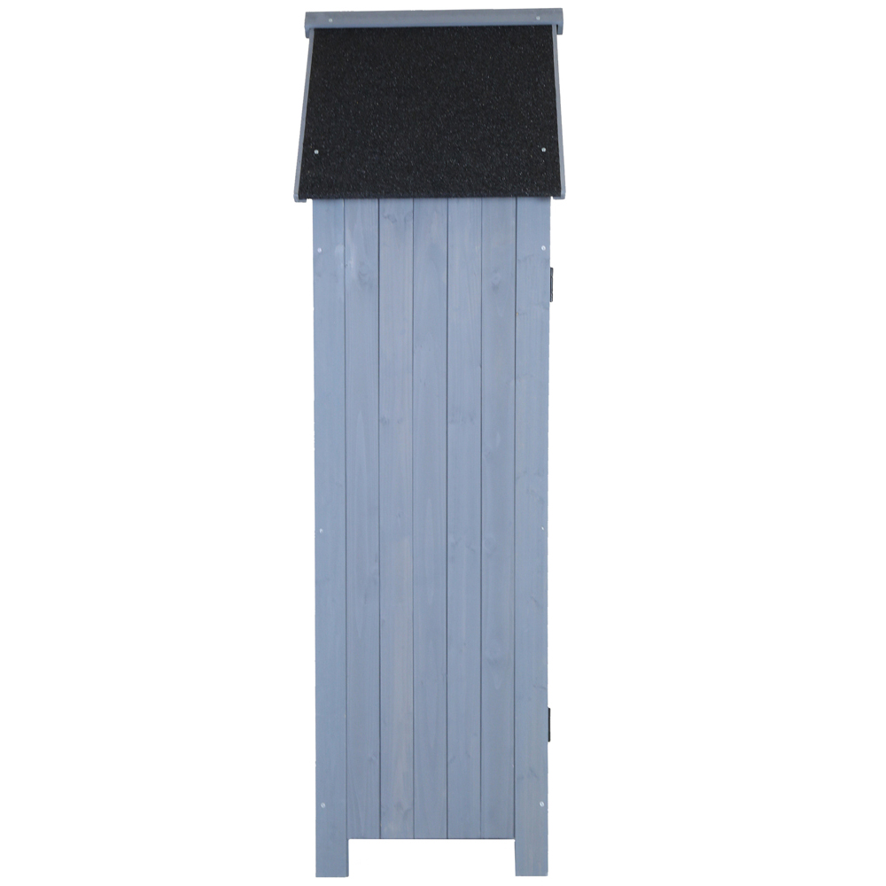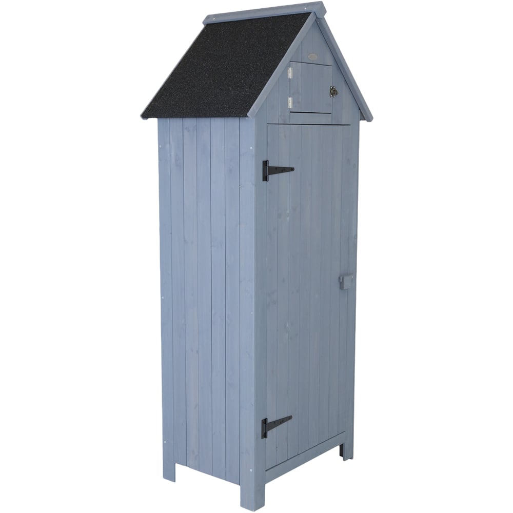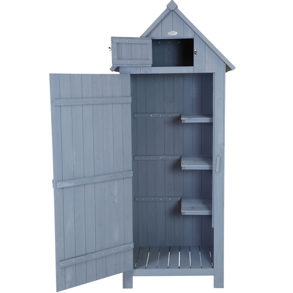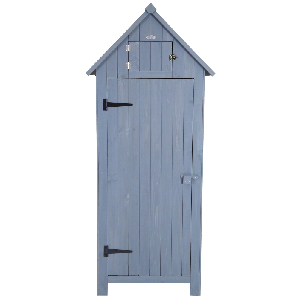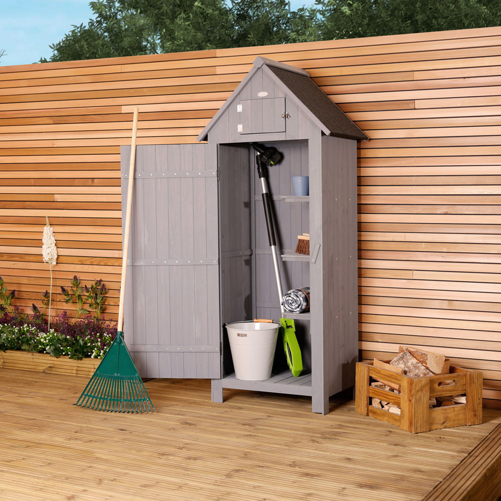 Charles Bentley FSC Slim Tall Garden Storage Shed in grey is the perfect storage alternative to a full size shed. The Sentry style garden shed keeps the look and durability of a classic wooden shed but in a more compact size. Great for garden tools, outdoor furniture or children's toys. Use this garden shed to keep your garden tidy, organised and your valuables protected. The 179cm height allows for taller items to be stored as well as smaller ones, and with a metal lock, ensuring your valuable garden tools and accessories can be kept safe. With three shelves, it's now easier than ever to organise your tools and equipment. It features a Hutch for extra storage, a wooden lock on a large door and a metal lock for the hutch. Extra height enables the storage of tall items. Assembly is required.