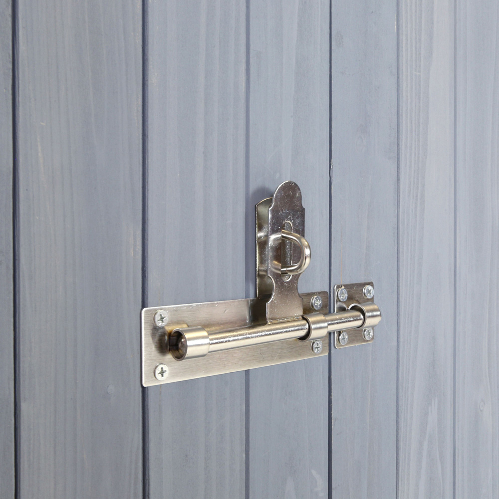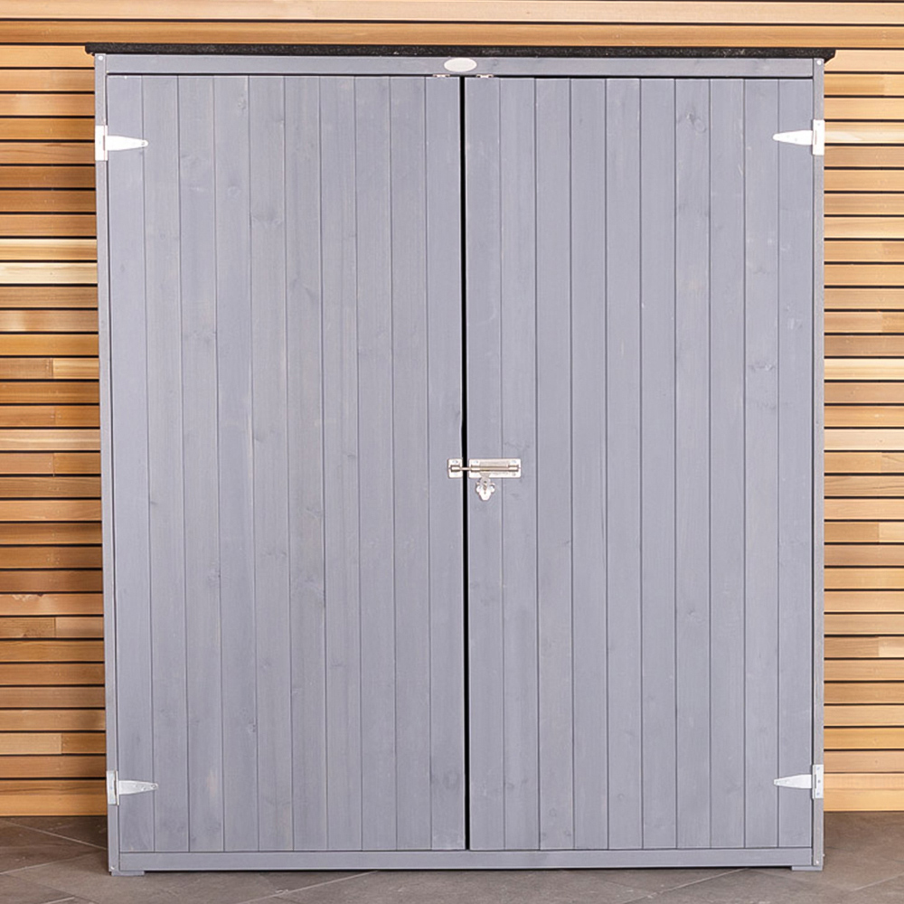 Charles Bentley FSC Garden Chest Storage Shed in grey is the perfect storage alternative to a full size shed. Keep the look and durability of a classic wooden shed but in a more compact size. Great for garden tools, outdoor furniture or children's toys. Use this garden storage shed to keep your garden tidy, organised and your valuables protected. The 138cm width provides sufficient space for sizable garden tools and accessories. With a bolt lock and additional padlock space, this creates the ideal place to store your valuables when not in use. The vertical cladding double doors provide easy access, and four hooks allow items to be hung while stored, freeing up space on the floor for other things. It features two shelves to organise tools and equipment and a bolt lock with additional space for a padlock.