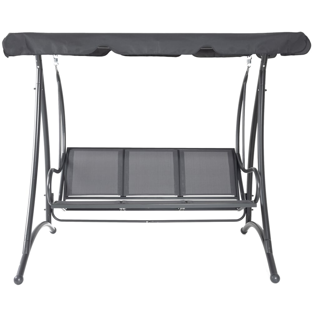Embrace the warmth of summer with the enchanting Charles Bentley 3 Seater Grey Garden Swing Seat with Canopy, designed for ultimate relaxation and enjoyable moments with loved ones. This beautifully curved seat comfortably accommodates two to three people, inviting you to sway gently while basking in the soothing ambience. With its durable mesh fabric and generous sunshade canopy, you can enjoy a delightful retreat in any season, spring, summer, autumn, or winter. Crafted from rust-resistant coated steel, this swing seat promises lasting enjoyment, perfect for relaxation or light napping during lazy afternoons. Some self-assembly required. Full instructions provided. Materials: Powder coated steel, 160g polyester. Dimensions: Product Height: 170cm. Product Width: 194cm. Product Depth: 121cm. Bench Width: 145cm. Weights: 36kg. Maximum user weight: 280kg.