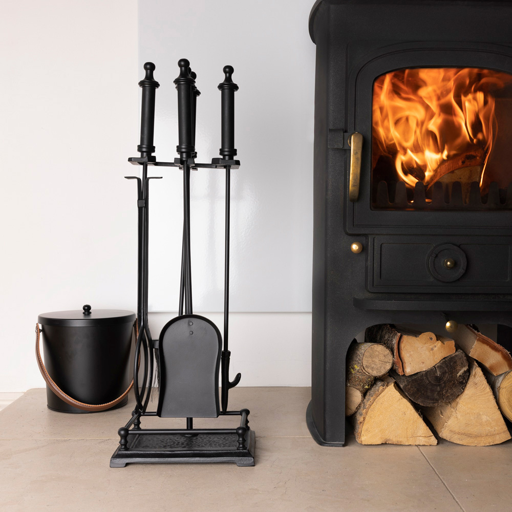 Add style and sophistication to your fireside with the Charles Bentley Black Lilac Fireside Companion Set. This four-piece companion set has iron frames with aluminium handles for durability. It features a pair of tongs, a brush made from natural coco fibres, a poker and a coal shovel. Also, its rectangular base comes with a perimeter surround, holding any fallen ash or debris within its bounds. Plus, the traditional design and the black matte finish make this companion set a must for those cold nights by the fireside. Ideal for indoor use only. Model no.: HMFIRESIDE57. Size: 61 x 16 x 23cm.