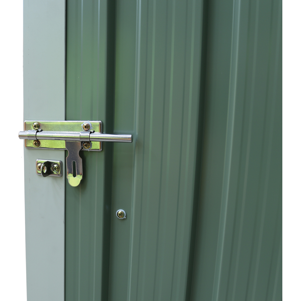 This metal garden storage shed is ideal for storing garden and DIY equipment such as lawn mowers, power tools or small garden furniture. The metal shed features 1 door and a steel structure making it durable and long lasting. This item has a light green colour with beige trim allowing the shed to subtly blend in to the garden and has a lock on the door for added safety. Please Note: The shed must be installed on a level wooden platform or level concrete foundation that is not included. The base of the unit measures 4.3 x 2.6 m while the top panel overhangs to 4.7 x 3 m. Features include: lockable doors, (a bolt with holes for a padlock, please note the padlock is not supplied), door handles, sloped roof and safety lock. Assembly is required.