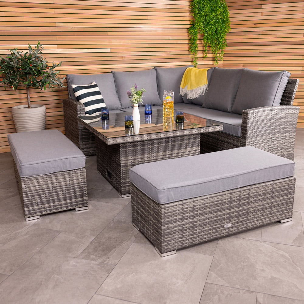 Relax outdoors in luxurious comfort with this contemporary Charles Bentley rattan lounge set. It's perfect for adding a stylish touch to any garden or patio. The lounge set will comfortably seat 4-8 people and comprises of a large corner sofa, 2 large stools and cushions for added support. This outdoor furniture set also features a large table with an adjustable height which is perfect for a relaxed dining experience. It's made from a flat weave, variegated rattan which is weatherproof to withstand harsh elements for added peace of mind. Dimensions: 3 Seater: H84 x L190 x D72cm. 2 Seater: H84 x L130 x D72cm. Stool: H32 x L100 x D45cm. Table: H68/52 x L100 D100cm. Seat Cushion: 8cm. Seat height: 32cm. Rattan thickness: 1.2mm Protect your garden furniture with our durable and waterproof covers. Explore our wide range of heavy-duty Garden Furniture covers to find the perfect fit for your needs.