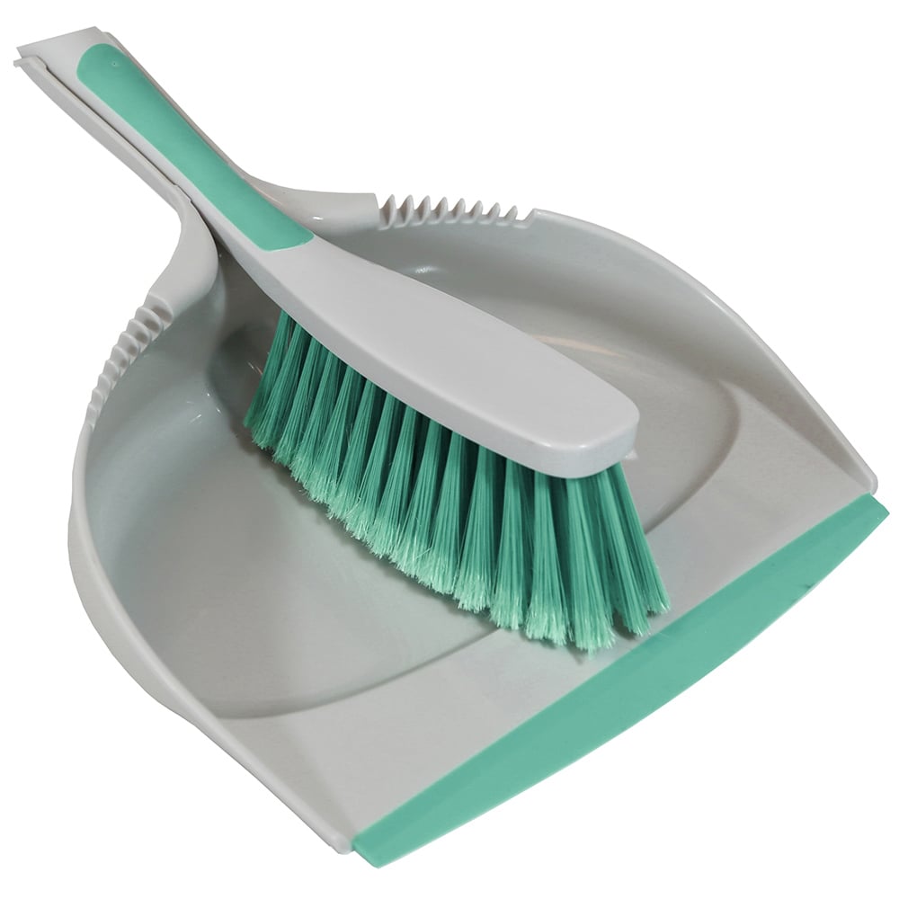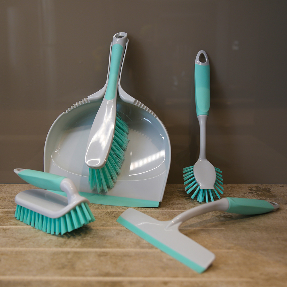 The Charles Bentley Mint Green Cleaning Set contains everyday essentials to help keep your home spotless. The set, made from sturdy plastic with soft grip handles, comprises a dustpan and brush, dish brush, scrubbing brush and squeegee. Collect dust and small debris in one clean sweep with this handheld brush. This set, designed with soft, flagged bristles to trap dust, is perfect for use on hard floors. The dustpan's large rubber trim ensures a non-slip base and helps contain debris inside the pan. Easy to clean, use the integrated teeth to comb out debris from brush bristles. Perfect for everyday washing up, the dish brush is designed with stiff, fan-tailed bristles to easily reach the corners of pots and pans. An integrated scraper can be used to dislodge stubborn stains. Perfect for tougher cleaning, the handheld iron scrub brush has stiff and angled bristles, ideal for cleaning tiles and hard floors or deep cleaning around the kitchen and bathroom. The squeegee is ideal for a streak-free finish on glass and tiles. Using the robust rubber blade, easily wipe away excess water to enable the surface to dry quickly.