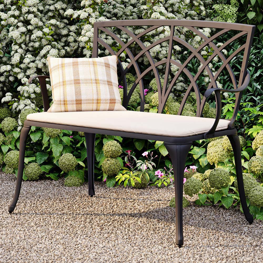 This cast aluminium bench is ideal for a patio or terrace area and would fit easily in any garden. The bench comes with a cream seat cushion for added comfort. It is relatively lightweight, making it easy to move, and requires minimal maintenance, which means it can be left outside all year round. The distinctive, elegant design is classic and timeless. Protect your garden furniture with our durable and waterproof covers. Explore our wide range of heavy-duty Garden Furniture covers to find the perfect fit for your needs.