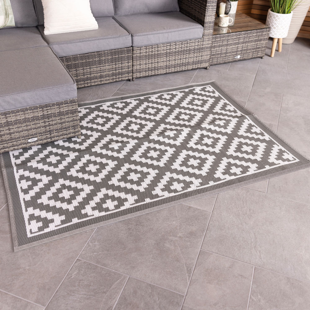 Give your home a conveniently-stylish makeover with Diamond Grey Waterproof Rug. This geometric pattern rug is versatile and durable. It is perfect for high-traffic areas such as kitchens and conservatories. Suitable for outdoor patio spaces as well. It is UV resistant and easy to clean and maintain, making it durable yet stylish. The rug is suitable for indoor and outdoor use. It's made from 100% polyester with fabric edging for stability. Size: W120 x L170cm.