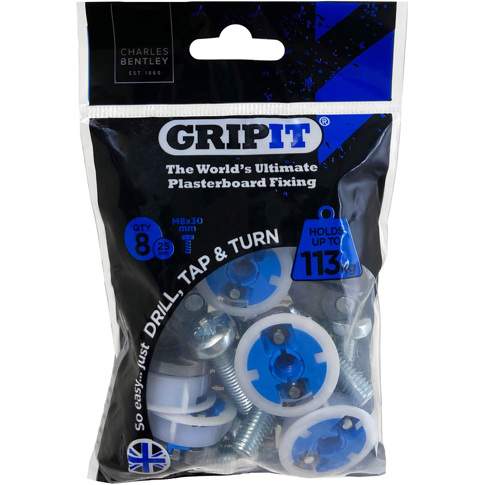 Using their uniquely patented designed slim gripping wings, GRIPIT Fixings fold out in the gap behind the plasterboard to create one of the most effective and secure fixings on the market today. Ideal for DIY & Trade - hang curtain rails, book shelves and kitchen/bathroom units, to radiators, boilers and wall mounted TV's. Traditional plasterboard fixings, although initially secure often fail over time. GRIPIT fixings are unique plasterboard fixings that provide the perfect solution to this enduring problem. They are easy to position and fit, and provide a strong, secure fixing for most wall-mounted items. The design spreads the load over twice the diameter of the fixing ensuring the even distribution of any stresses over a wide area. Suitable for use in 9.5 to 15mm thick plasterboard, GRIPIT fixings are easy to fit. Mark the location, drill the hole using the recommended size flat bit and tap in the GRIPIT. Push in the insert with a screwdriver and a simple twist spreads the GRIPIT wings behind the board; job done. The Blue GRIPIT fixings come with M8 machine bolts. GRIPIT fixings are reusable: simply turn wing screws to release and remove. If you are unfortunate enough to encounter double thickness plasterboard or dot and dab adhesive, the GRIPIT Undercutting Tool accessory creates a recess for the wings to rotate into place. As seen on the UK BBC's Dragons' Den television programme! - The plasterboard fixing that allows you to safely hang items up to 113kg.