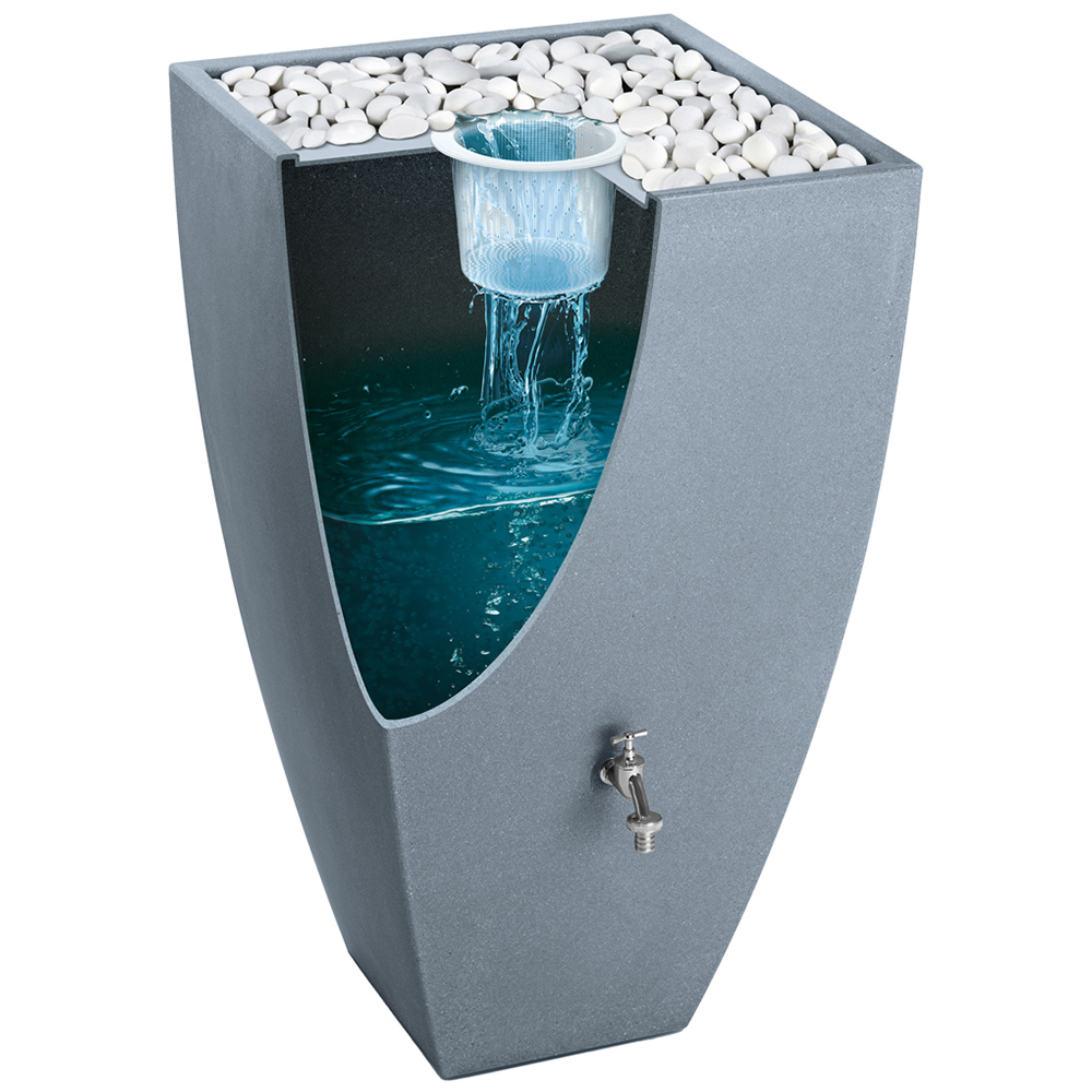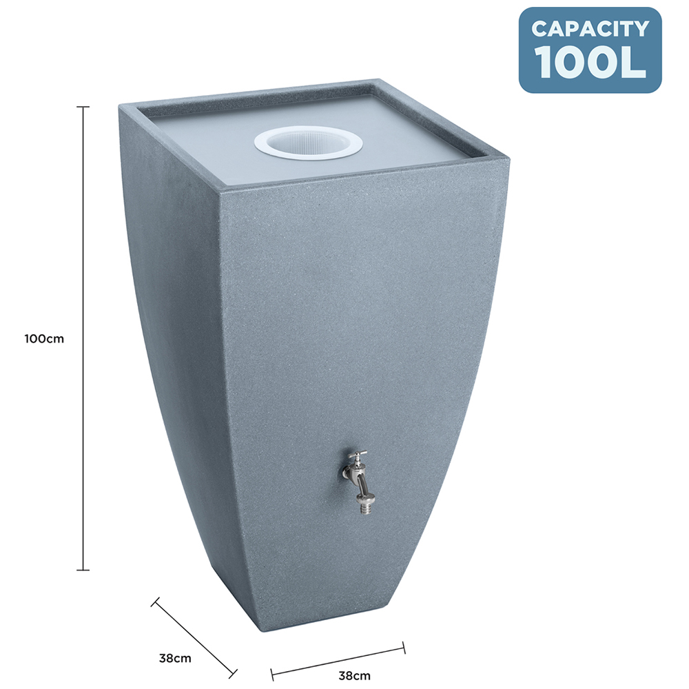 The Modena 100L Water Butt is a sleek and space-saving solution for rainwater collection, with the added bonus of doubling up as a decorative planter. Featuring a smooth grey finish and contemporary shape, this water butt brings a modern touch to your garden. Made from durable plastic, it holds up to 100 litres of water, making it perfect for year-round use, while the recessed top design allows you to make a real focal point by planting your favourite blooms. A sleek chrome tap provides easy access to your stored water, and the included connector kit makes installation to your downpipe system quick and hassle-free. It includes a 14-piece connector kit with a screw nut, a fitting connector, a connection nut with fitting, a 32mm hose connector, a 1-inch gasket, a coupling nut, a tank and hose connector 32mm, a connection of the fitting with a gutter adapter, water catcher 1-inch thread, water catcher, screws, core drilling rig, rubber detail and hose. Ideal for eco-conscious gardeners, it's a smart, space-saving way to collect, store, and reuse rainwater.