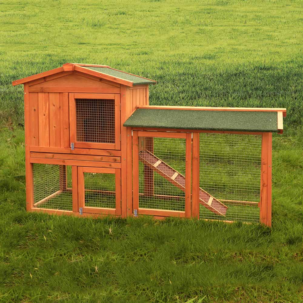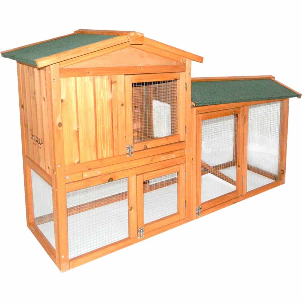 Create the perfect home for your small pets with this large two-storey hutch with run by Charles Bentley. Made from 100% Chinese fir wood with a waterproof treatment, the hutch carries the durability of wood as well as the classic, natural finish. The smartly designed hutch has a long run area, an open bottom to allow free grazing and a ramp for access between the two areas. On the hutch, there is strong galvanised mesh wire and stainless steel locks on the doors to give you the option to keep your pets safe. Its sloped roof is covered in hard-wearing asphalt felt to provide maximum protection against heat and rain. The wooden hutch is perfect to create a comfortable shelter for your small pets. Please note: Rabbits need regular and frequent opportunities to exercise. Make sure your rabbits have opportunities to exercise every day to stay fit and healthy. Rabbits are most active in the early morning, late afternoon, and overnight, so every effort should be made to ensure rabbits have access to a large area to exercise at these times. The hutch provides a shelter while rabbits should additionally be provided with a large living enclosure. Note: Some self-assembly required. Full instructions provided. Materials used: 100% Chinese fir wood, galvanised mesh, asphalt felt and stainless steel. Dimensions: Overall- H86 x D53 x W145cm, bottom storey- H31 / 45.8 x W125cm, top storey- H28 x W54cm, bottom door 1- H25 x W25.5cm, bottom door 2- H45.8 x W32.5cm, top door- H25.6 x W25.5cm. Weight: 18kg. Colour: Natural wood. Pair with the suitable Hutch Cover to protect against weather.