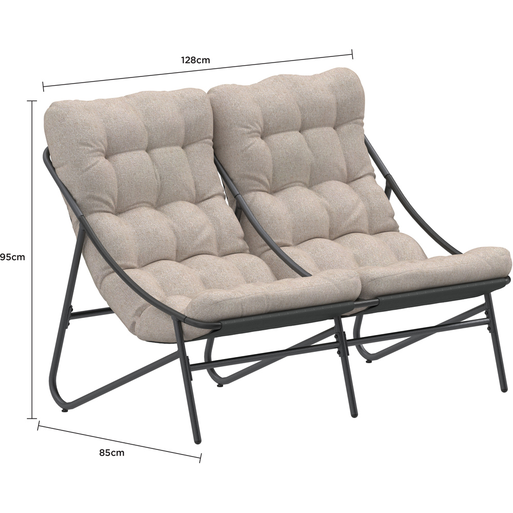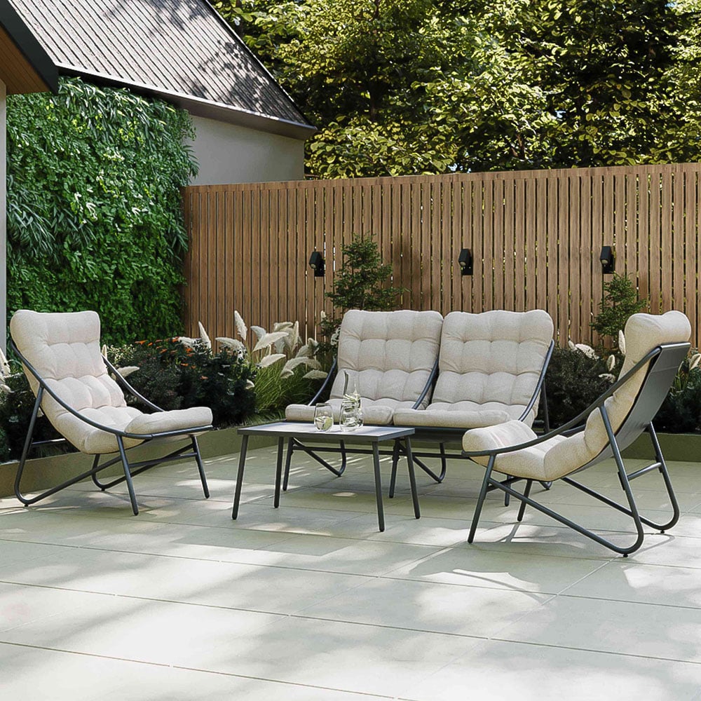 This Porto 4 Seater Lounge Set brings effortless style and relaxation to your outdoor space. Designed with a durable anthracite powder-coated steel frame, this spacious set includes a two-seater sofa, two armchairs, and a coordinating table, perfect for entertaining or unwinding in comfort. The deep-filled oatmeal-coloured cushions offer soft, supportive seating, inviting you to sit back and relax. Whether you're enjoying a morning coffee or hosting friends for the evening, this elegant lounge set is a timeless addition to any garden. Olefin fabric is sensitive to direct heat sources and can fade if left exposed to direct sunlight for prolonged periods. The fabric is resistant to light amounts of water and should be covered with a water-resistant and UV-resistant cover during harsh weather conditions. Dimensions: (Sofa: H:95xW:128xD:85cm) (Chairs: H:95xW:66xD:85cm) (Table: H:42xW:75xD:43cm).